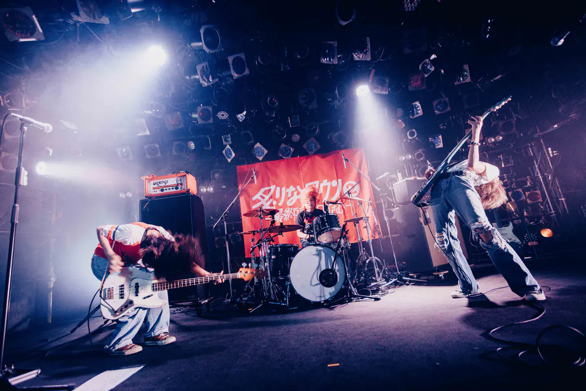 炙りなタウン自身もまた、全力でステージに向かっていく。観客の前に現れたゆきなり(Gt/Vo)は、楽器を構える前に胸に手を当て、呼吸を整えた。いつもより広いライブハウスということで、緊張しているのかもしれない。そして、しおきち(Ba/Vo)、めぐぞう(Dr/Cho)とともに最初の一音を鳴らす。緊張を振り払うような前のめりなスタートは、心のままに音楽を鳴らす彼女たちらしかった。