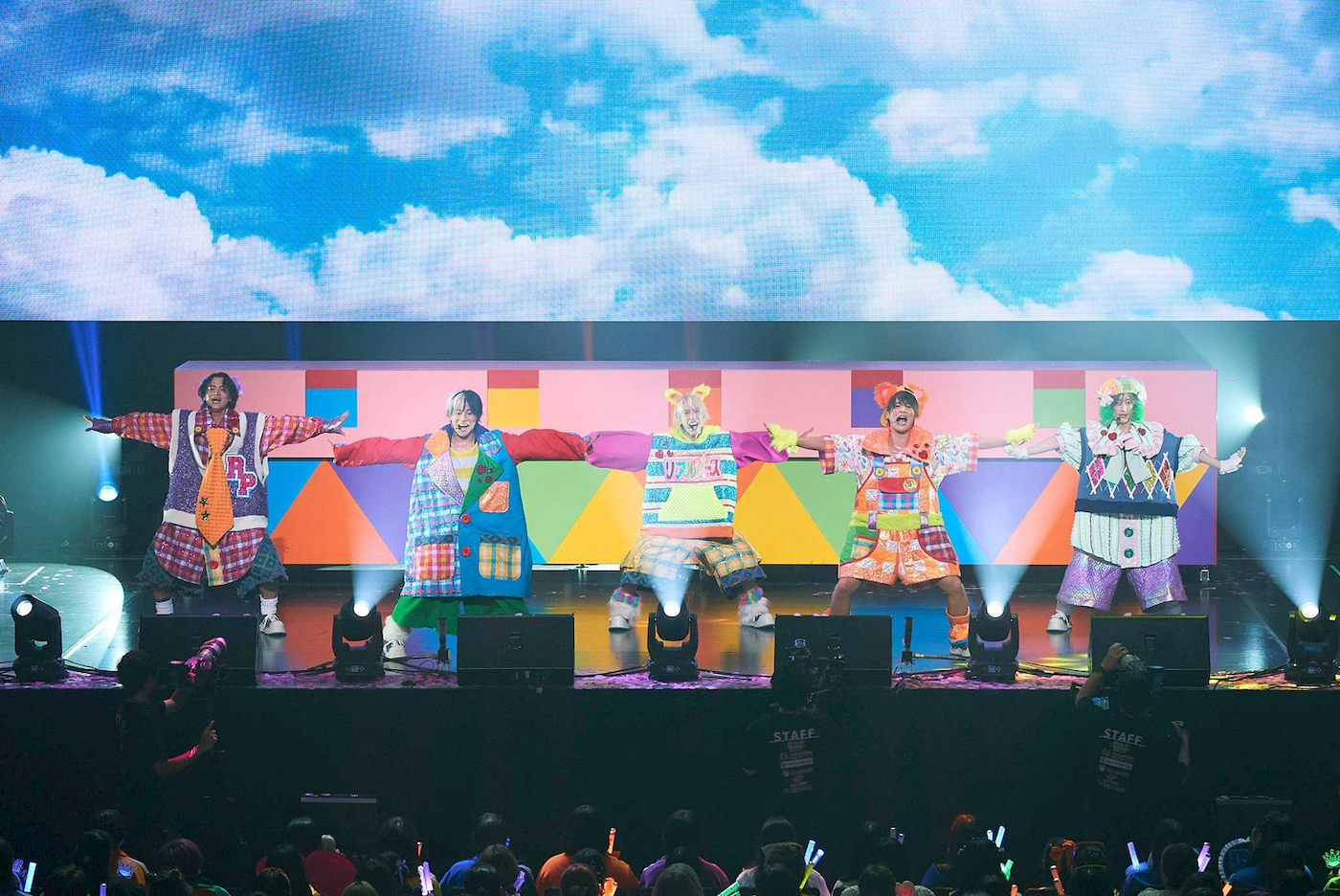 「こぺは小さい頃、自分を表現するのが苦手な子でした。今はYouTubeで『かわいいものが好き』『キラキラしたものが好き』と言っていますが、小さい頃はそういう世界は自分に似合わないと思っていて。どっちかというと、教室の隅っこで絵とか描いている子でした。友達関係も正直上手くいったことがなくて、周りとズレていると思って、早く大人になりたいなって。でも、そういう惨めな自分も僕だからって今は思います」と、こぺは思いを自分の言葉で伝えていく。そして、「これからみんなとリアルピースで一緒に作っていくストーリーを願って歌うので聴いてください」と曲振り。「物語」を歌い始める。おとぎ話のような世界観が広がったところで、空気が一変。ゴリラの格好をしたダンサーが客席に登場。「モンブランヘッド」だ。こーたが「声出せー!」と煽ると、観客の声も一層大きくなっていった。「生きていればツラいことだってある! でも、そんな時は俺たちが心のなかにいることを忘れるなー!」というこーたの声で「プレパラートハート」へ。メンバーたちはステージ上を端から端まで駆け回りながら、観客に言葉を届けるように歌い上げていった。