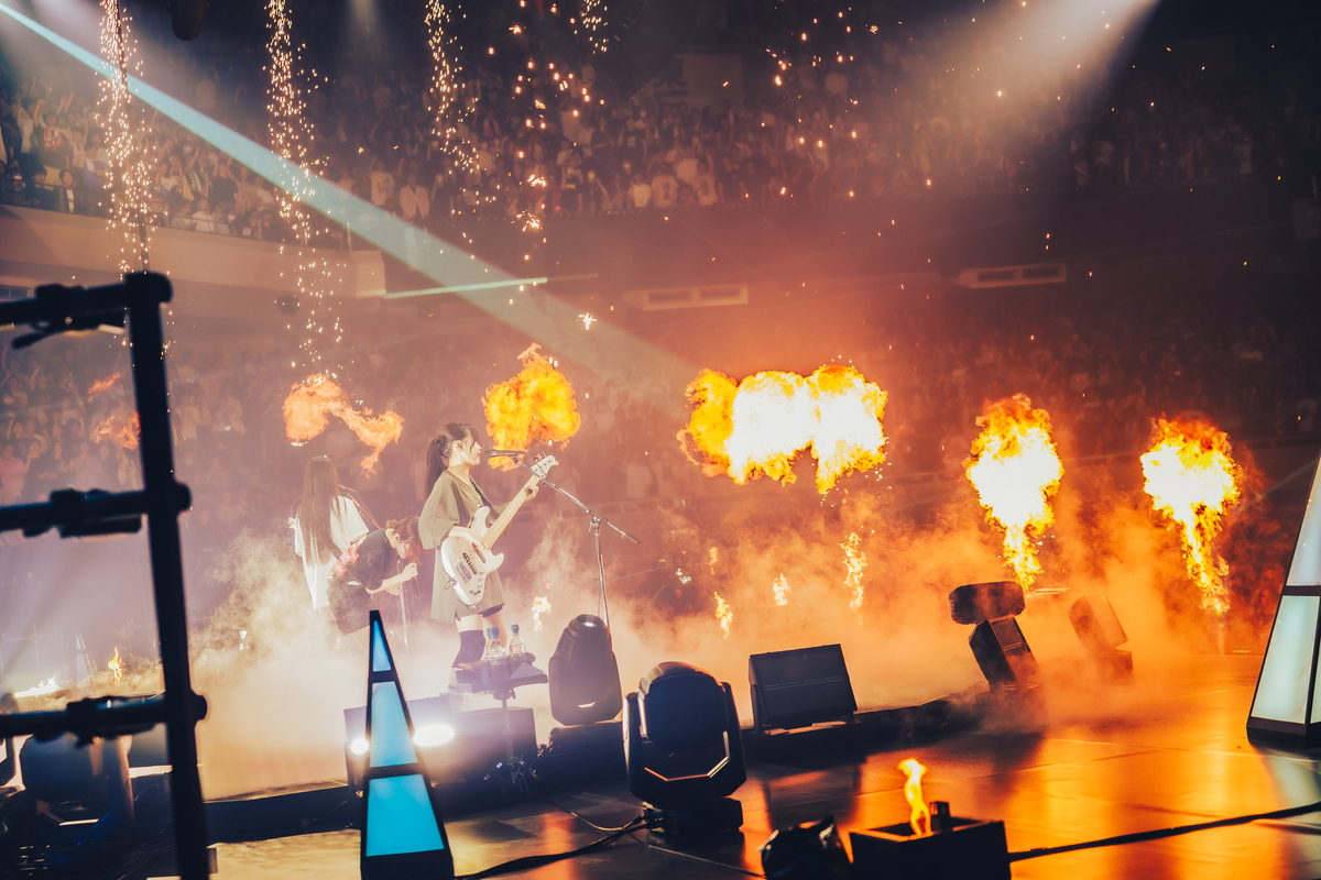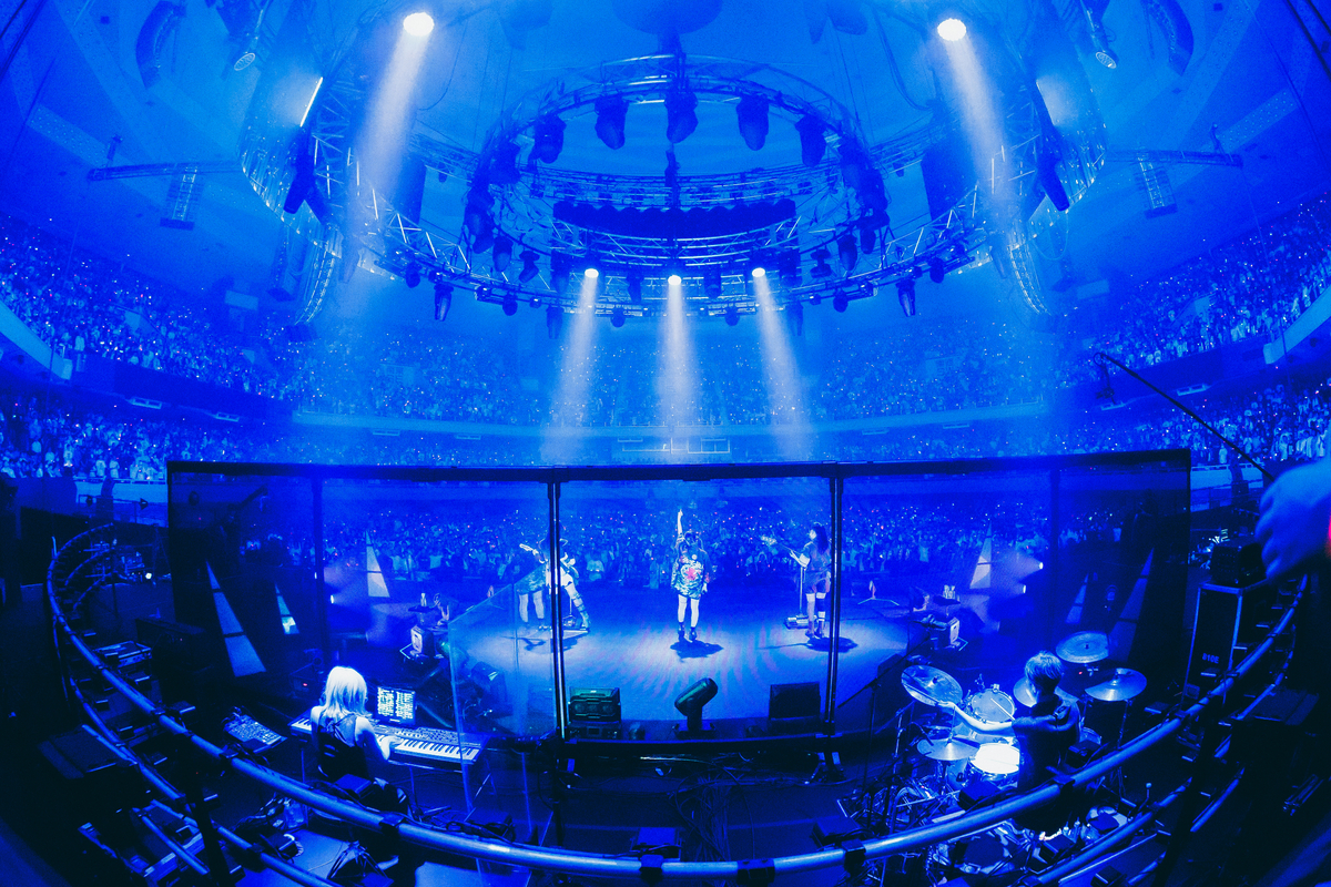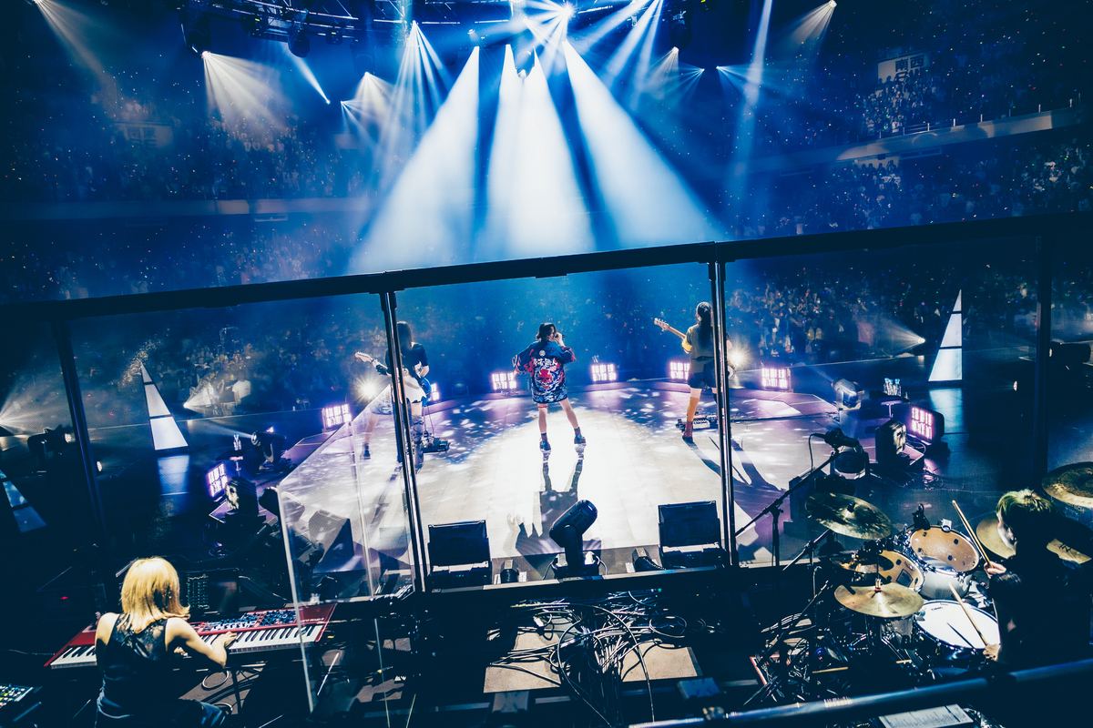 序盤こそ若干の緊張を見せたが、次第にいつもの朗らかなトークを繰り広げる3人のMCを随所に挟みながら、演奏になると時に満面の笑みで、時に鬼気迫る表情で個々の力量を発揮し続ける彼女たち。会場中を飛び交うレーザーが幻想的な空気を生み出す「闇に溶けてく」、もはや恒例となった冒頭での朱李のベースソロが武道館を沸かせた「空白とカタルシス」、赤い照明とスクリーンに描かれる赤い糸が印象的な「蝶に結いた赤い糸」、高速ビートに合わせてステージ前方に炎が吹き上がる「サヨナラサヨナラサヨナラ」など、大会場ならではの派手な演出と緩急に富んだセットリストでオーディエンスを魅了していく。