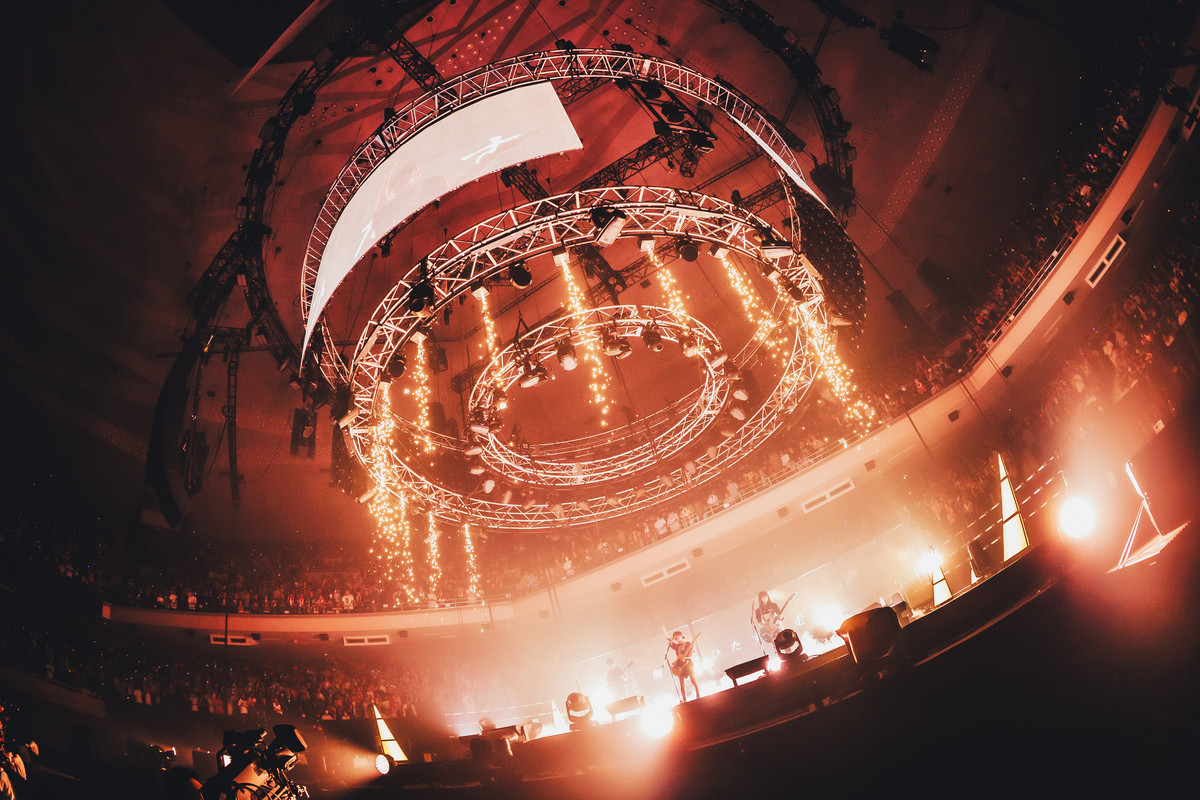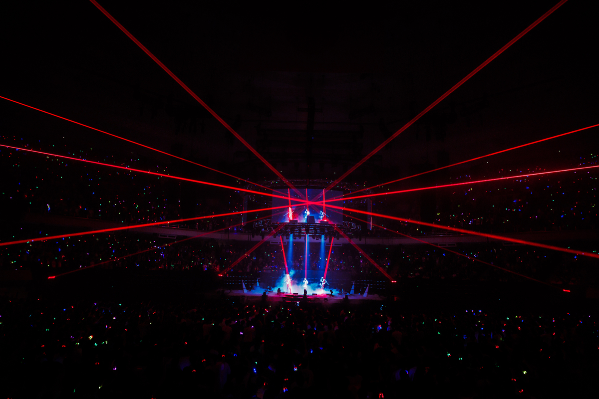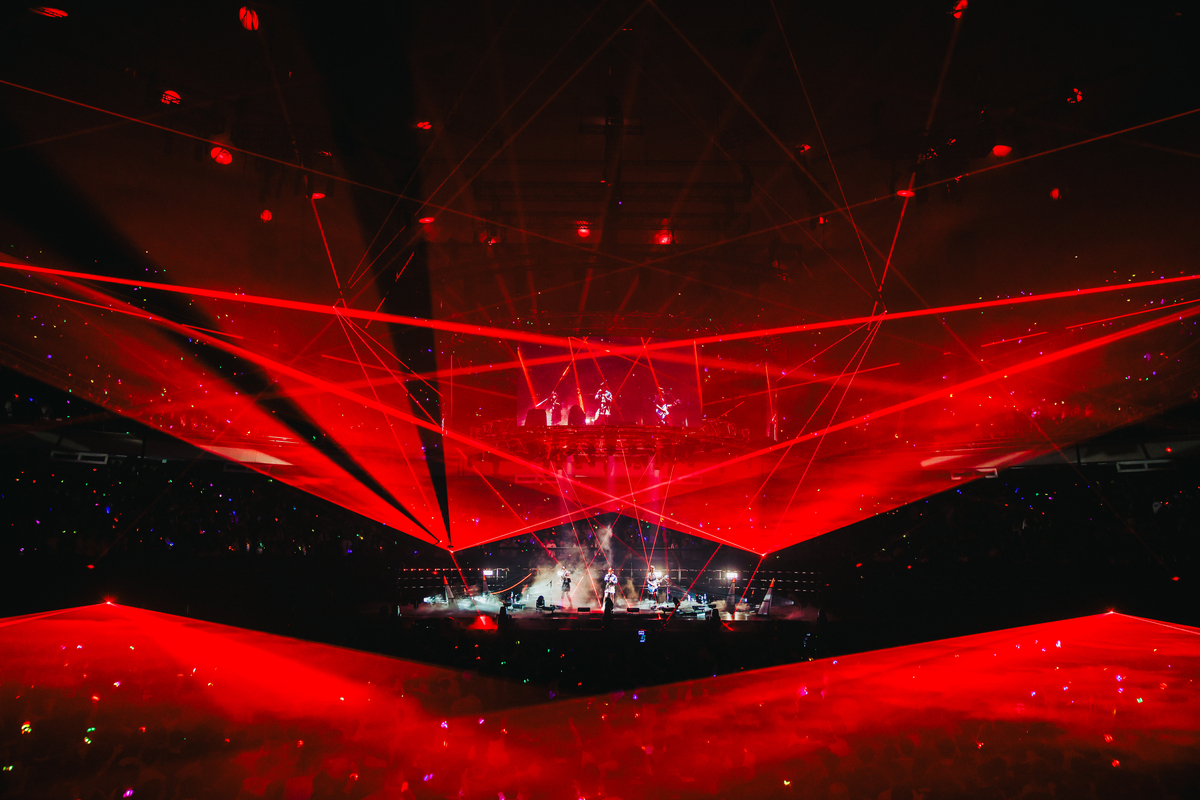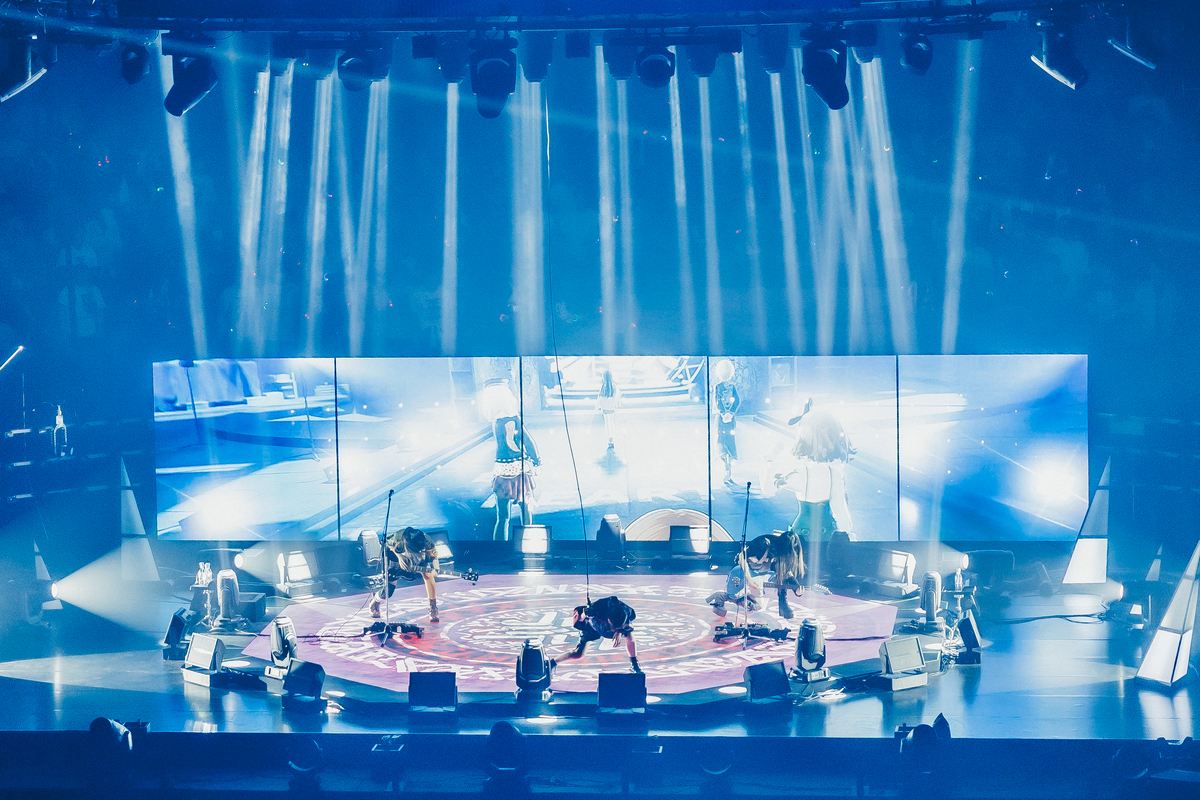 序盤こそ若干の緊張を見せたが、次第にいつもの朗らかなトークを繰り広げる3人のMCを随所に挟みながら、演奏になると時に満面の笑みで、時に鬼気迫る表情で個々の力量を発揮し続ける彼女たち。会場中を飛び交うレーザーが幻想的な空気を生み出す「闇に溶けてく」、もはや恒例となった冒頭での朱李のベースソロが武道館を沸かせた「空白とカタルシス」、赤い照明とスクリーンに描かれる赤い糸が印象的な「蝶に結いた赤い糸」、高速ビートに合わせてステージ前方に炎が吹き上がる「サヨナラサヨナラサヨナラ」など、大会場ならではの派手な演出と緩急に富んだセットリストでオーディエンスを魅了していく。
