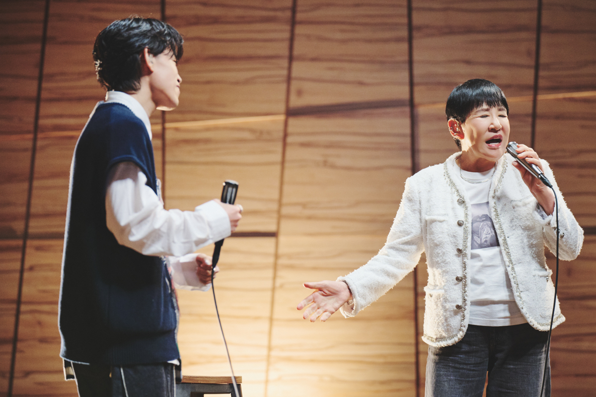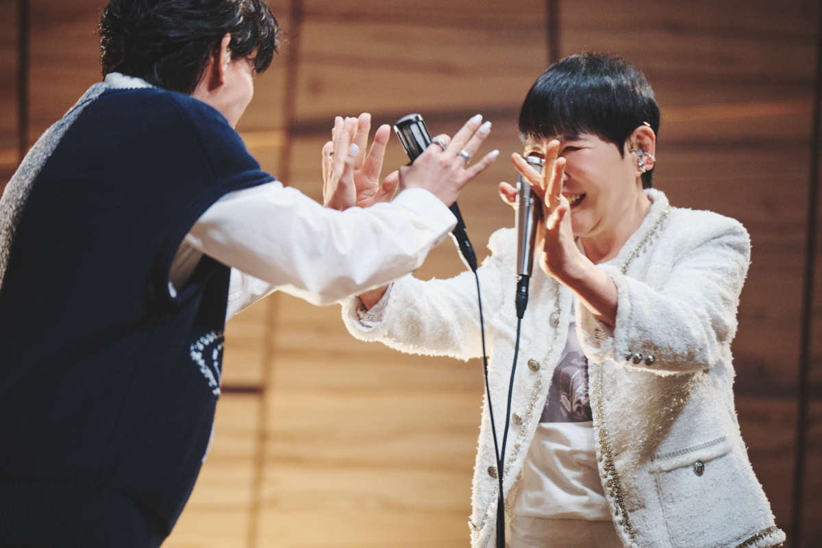 そして2コーラス目は和田へとバトンタッチ。さすがだった。描かれている風景、刻まれている想いが鮮やかに浮かび上がるかのよう。繰り替えされるサビを各々が歌った後、エンディングはふたりのロングトーン。視線を交わしながら響かせる歌声が清々しい余韻を生む。スタッフが拍手をすると、ふたりは満面の笑みを浮かべながらハイタッチを交わした。