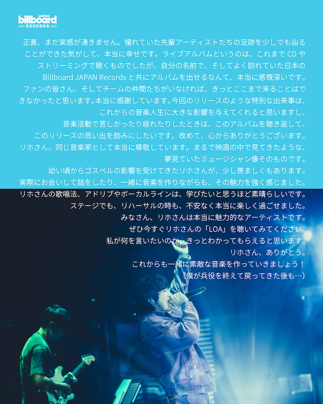 正直、まだ実感が湧きません。憧れていた先輩アーティストたちの足跡を少しでも辿ることができた気がして、本当に幸せです。ライブアルバムというのは、これまでCDやストリーミングで聴くものでしたが、自分の名前で、そしてよく訪れていた日本のBillboard JAPAN Recordsと共にアルバムを出せるなんて、本当に感慨深いです。
