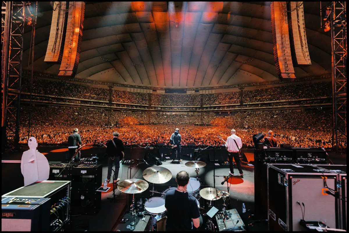 Oasisの再結成が発表されたのが2024年8月27日で、日本公演がアナウンスされたのが11月22日。同日からチケットの先行受付が始まり、「取れた!」「取れない!」「何とかしてくれ!」「頼むよマジで!」といった声が渦巻きまくる。それからチケットの一般発売があってまたしても阿鼻叫喚となり、その後もリハが始まったとか、こんなグッズがあるとか、「ツアーが始まるまで安心できない。始まってもすぐ兄弟が揉めるんじゃないか」とか、様々な憶測や希望が飛び交うなか、今年の7月4日にUKウェールズのカーディフにあるプリンシパリティ・スタジアムから本当にツアー『Oasis Live '25』がスタート。瞬く間にライブの映像が世界中でシェアされ、観客がアップした動画をつなげて丸々1本のライブ映像にしてしまうツワモノまで現れたので、ツアーが始まった数日後には「なるほど、こんなライブなのか」とわかったつもりになってみたが、実際に観るまではもちろん何とも言えなくて、そのうちに現地UKで早々にライブを体験した人たちも続々と現れたりして、羨ましいやら悔しいやら。筆者は音楽ライターなので日々いろんなミュージシャンに取材しているのだが、彼ら・彼女らの多くも我々と同じで、「やっぱり観たいですよね」「行くんですか?」「チケット取れたんですか!?」「演奏すごいらしいですね」「というか、その日は自分のライブだから行けない」みたいな会話が、「それにしても暑いですよね」と同じくらいの頻度で交わされた2025年の日々を経て、10月25日・26日の2日間、ついに東京ドームのステージにOasisが現れたのだった。