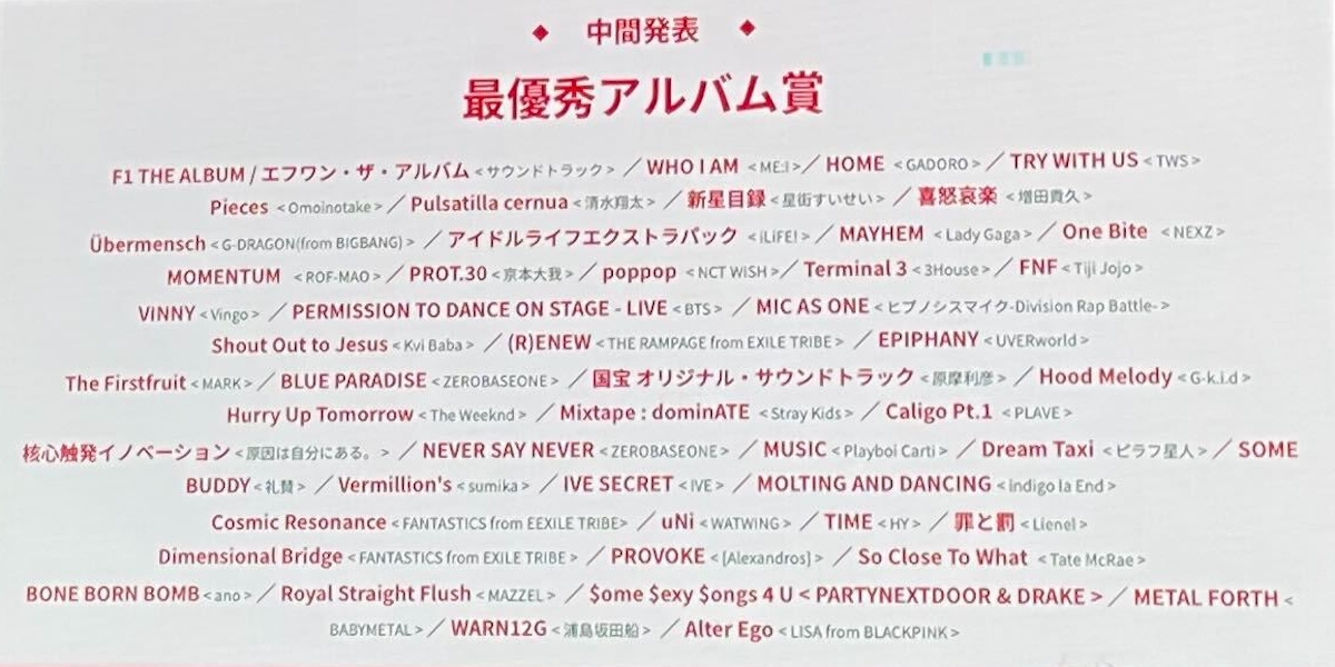 フルバージョンのオフィシャル音源および画源が、2025年1月1日(水)〜12月31日(水)の間に初めて公的サービスにおいてデジタル配信、もしくはフィジカル発売された作品(楽曲/アルバム)を対象とする。