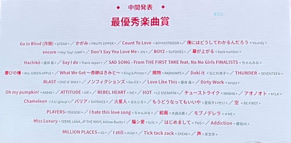 ※楽曲部門において、1アーティストで複数楽曲がノミネートとなった場合、5アーティストになるまでノミネート楽曲の作品数を増やすものとする。