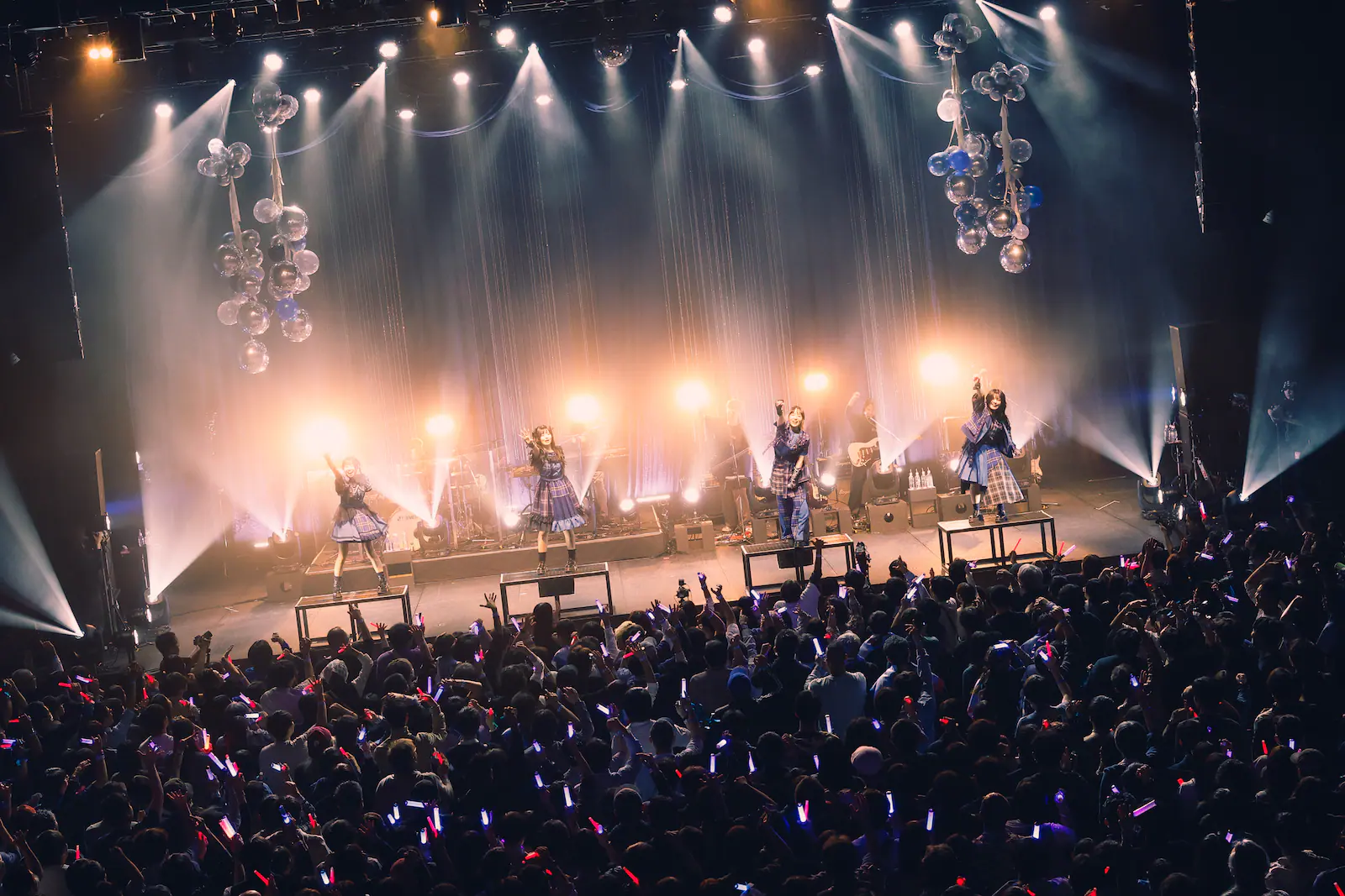 オープニングVTRでは、青いバースデーケーキが映し出され、メンバーが広瀬みのり、月雲ねる、青柳透、綾瀬志希の順で登場し、お祝いをする場面も。そして、低いベース音が鳴り響くなか、「飴玉」でライブはスタート。すると、ステージ上の紗幕越しにCYNHNのメンバーがおり、歌詞とグラフィックが投影されるVJとともにライブが展開された。演奏を務めるのは、ギターの中村純一とkurara、ベースのアベノブユキ、ドラムの西沢拓海、キーボードの桑原康輔の5人からなるバンドだ。