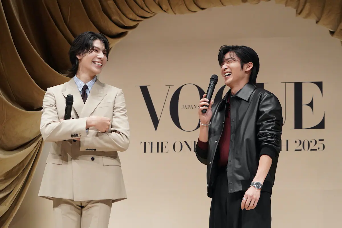 授賞式にSnow Manから目黒蓮、ラウールが登場。受賞の感想をラウールは「『VOGUE』さんから賞をいただけるというのはとても光栄に思いますし、誌面の方にも関わらせていただいたので(『VOGUE』との)縁を感じています」、目黒は「Snow Manのメンバーもみんな喜んでいましたし、すごく光栄なことだよねっていう話をしました」と明かした。