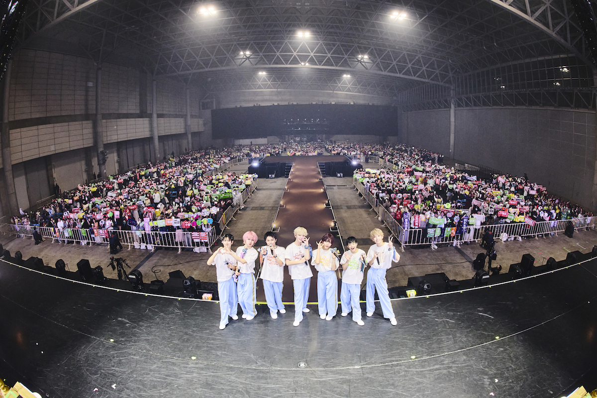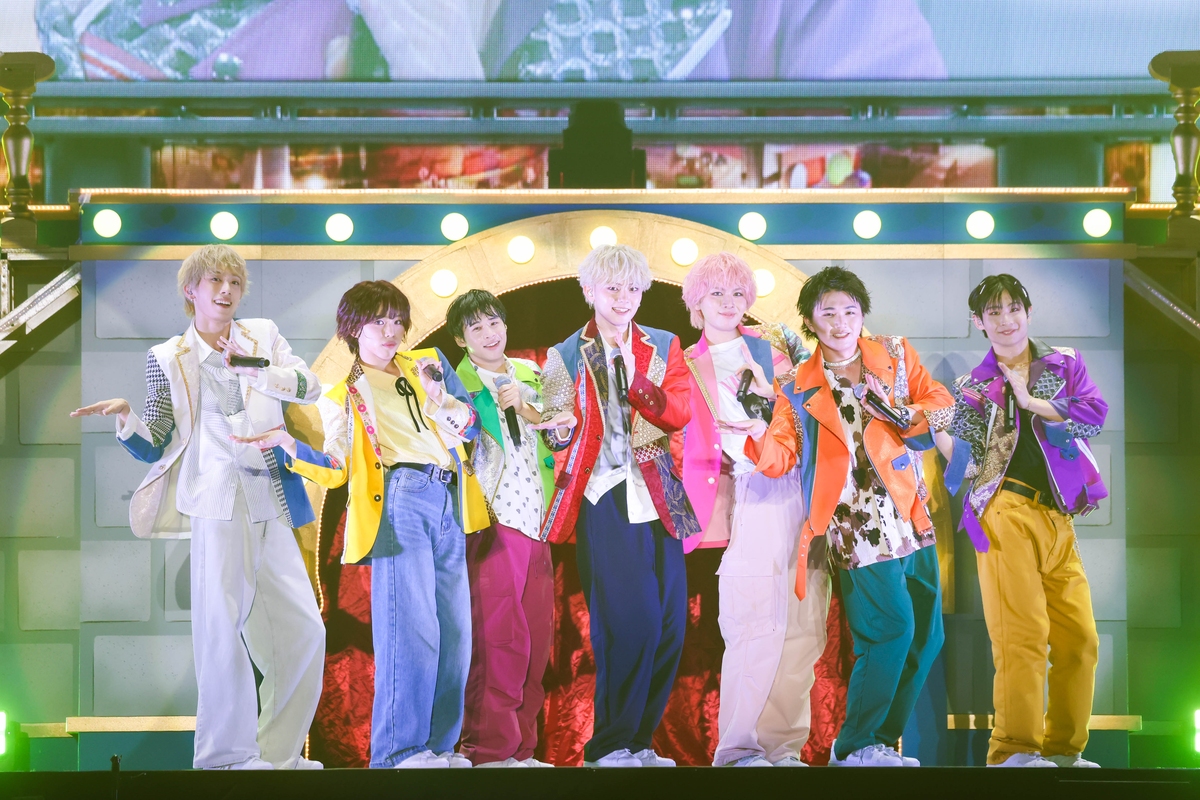 再びいつもの元気な表情に戻った7人は、花道を楽しそうに歩いていく。その道中でココナッツ、メロン、レモン、アップル、オレンジ、ピーチ、グレープと、それぞれのフルーツを見つける。試しにそれらを口に入れてみると、メンバーは夢のなかへ。パジャマを着た7人が空を飛ぶ映像を挟んで、黒とゴールドの衣装をまとい、スティックを手にした姿のメンバーが。続いて彼らが案内してくれるのは「ファンタジーマジックランド」だ。「ちょいドンマイ」では、堀内結流がおしゃぶり姿を見せるなどとびきりキュートな姿でおまじないをかけ、「I My Me Meow」ではカチューシャ姿になりネコ科の動物に変身。あまりのかわいらしさに、客席からは「かわいい!」の声が漏れ聞こえていた。ソファや椅子に腰掛けて「御伽話」のバラードアレンジをしっとりと届けたかと思えば、後半は原曲通りのジャジーなバージョンに。クールなダンスでも魅せ、ひと時も目を離せないステージとなった。