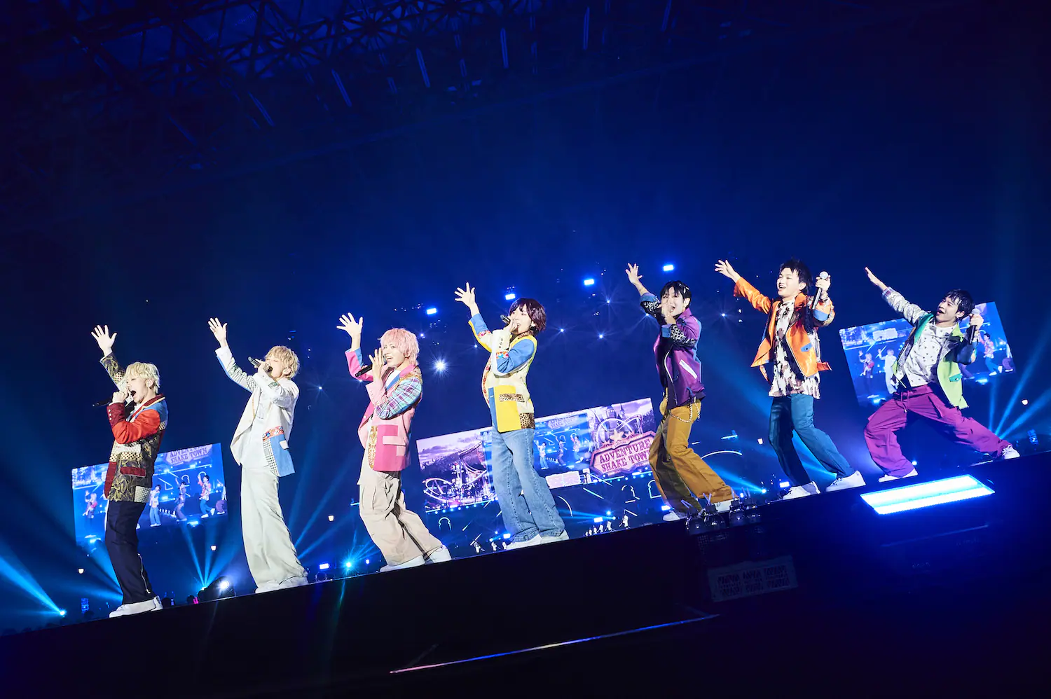 メンバーがセンターステージに集まると、最後の会場“アドベンチャーシェイクタウン”へ。「サクラフレフレ」でタオルを回したあとには、コール&レスポンスで盛り上がった「どーぱみんみん あどれなりんりん」、メジャーデビュー曲「まにまに」とヒャダインこと前山田健一提供曲を続け、さらなる盛り上がりを生み出す。「まにまに」では、花道に立っていたメンバーが、先頭の小田から順番にメインステージに戻っていく。そして7人全員がひとつになったところで、〈人生楽しんだもん勝ち〉〈僕たちの 将来は/ビビっと VIVID やけに明るいのさ〉と歌うラストのサビに入るという構成で、楽曲のメッセージを体現した。さらに阿部の「みんな違っていい。自分らしく、あなたらしく、最後まで楽しんでいきましょう」との言葉から「だいぶダイバーシティ」へ。〈好きなものを好きだと言おう!/できない事を恥じないでいよう!〉という、THE SUPER FRUITが届け続けてきたメッセージを、オーケストラアレンジに乗せて壮大に『THE SUPER FRUIT WORLD』に響き渡らせた。