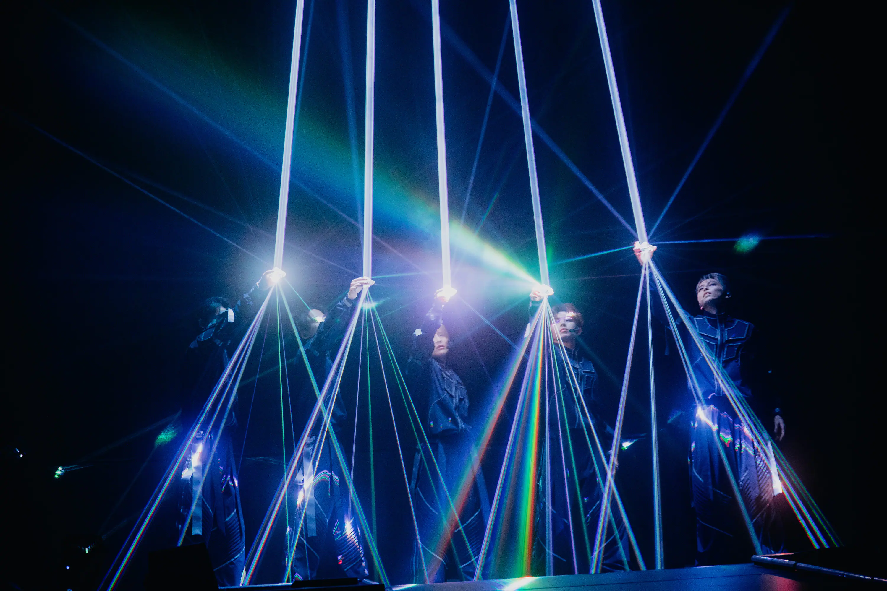 ラテン語で“光”を意味する『LUMINA』を、最も視覚的にも表現したのはこのMCのあと。砂漠でメンバーが頭上の光へと手を伸ばす映像を挟み、場内が暗くなると、ステージに向けて5つの青い光が差し込む。暗闇のなかで5人の姿だけが浮かび上がる中、静寂を切り裂くようにTETTAが〈光り the light/追いかけて/手に入れるまで/進むだけ〉と歌い始める。「The Light」だ。メンバーはひときわ美しい歌声で歌い繋ぎ、間奏では光を操っているようなダンスも見せる。SWAGのペンライトが点灯すると同時に〈強くなる輝き〉と歌い始める演出もニクい。曲が終わり、メンバーが光を集めていた破片を捨て去ると、〈散らばった無数のパズル集め/君の声が 僕の夢に 繋がってるだろう〉と歌う「Reflection」へ連なるセットリストにも感服した。