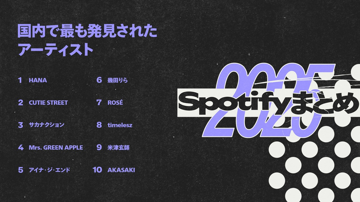 2025年、国内で最も発見されたアーティストはHANAだった。デビュー以来数々の楽曲をヒットチャート上位に送り込んできたHANAは、強いメッセージ性と個性豊かなメンバーの魅力で2025年の音楽シーンを席巻し、多くの新規リスナーを獲得した。 2位のCUTIE STREETは、代表曲「かわいいだけじゃだめですか?」に象徴される新たな”KAWAII”像を発信して支持を拡大。 HANAとはまた違った角度からの自己肯定感をテーマにした表現で、同世代のリスナーの共感を呼ぶ存在となっている。 以降、サカナクションや Mrs. GREEN APPLE、米津玄師、back numberなど、各種ランキングを賑わせたアーティストが並ぶ中、アイナ・ジ・エンドは7月のリリース以来、国内外で多くの支持を集めた「革命道中 - On The Way」のヒットによりリスナーベースを広げ、 5位にランクインしている。