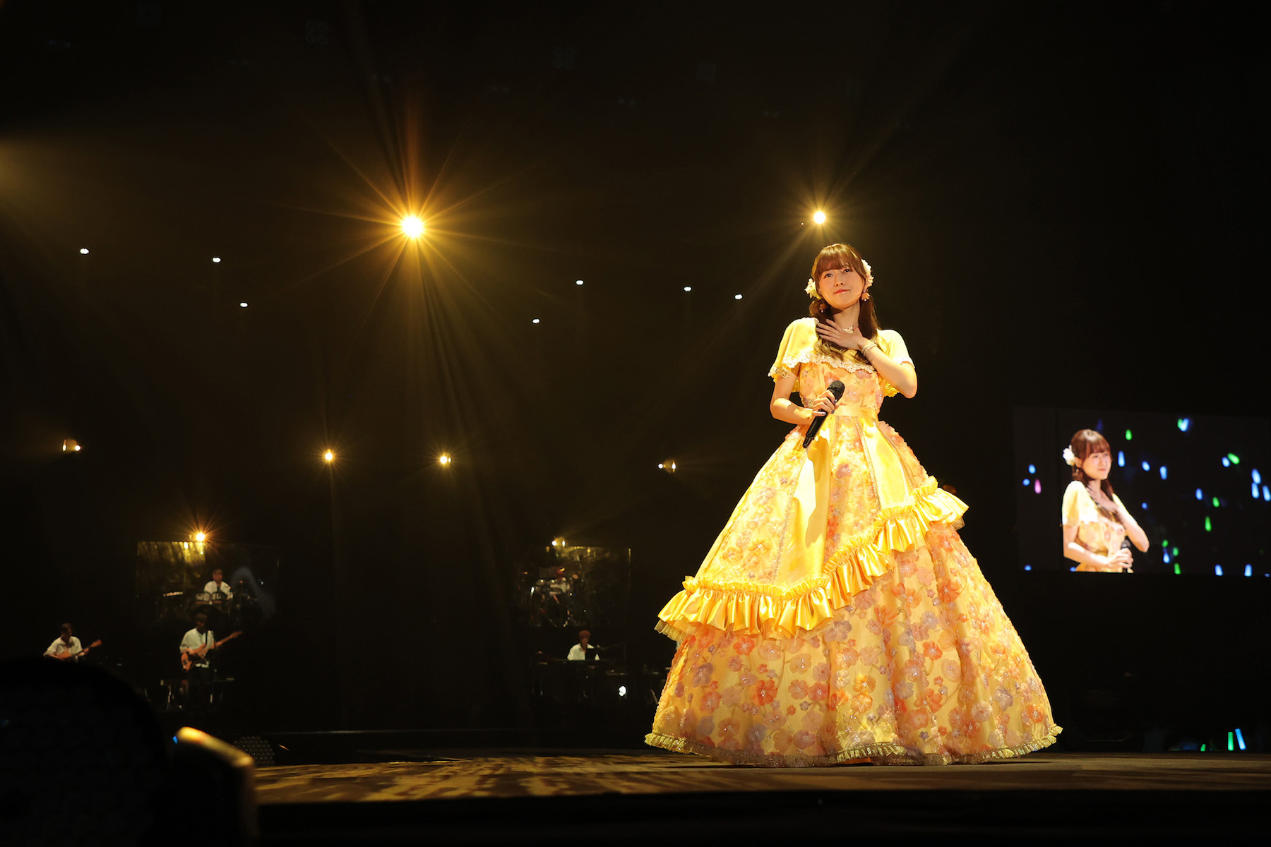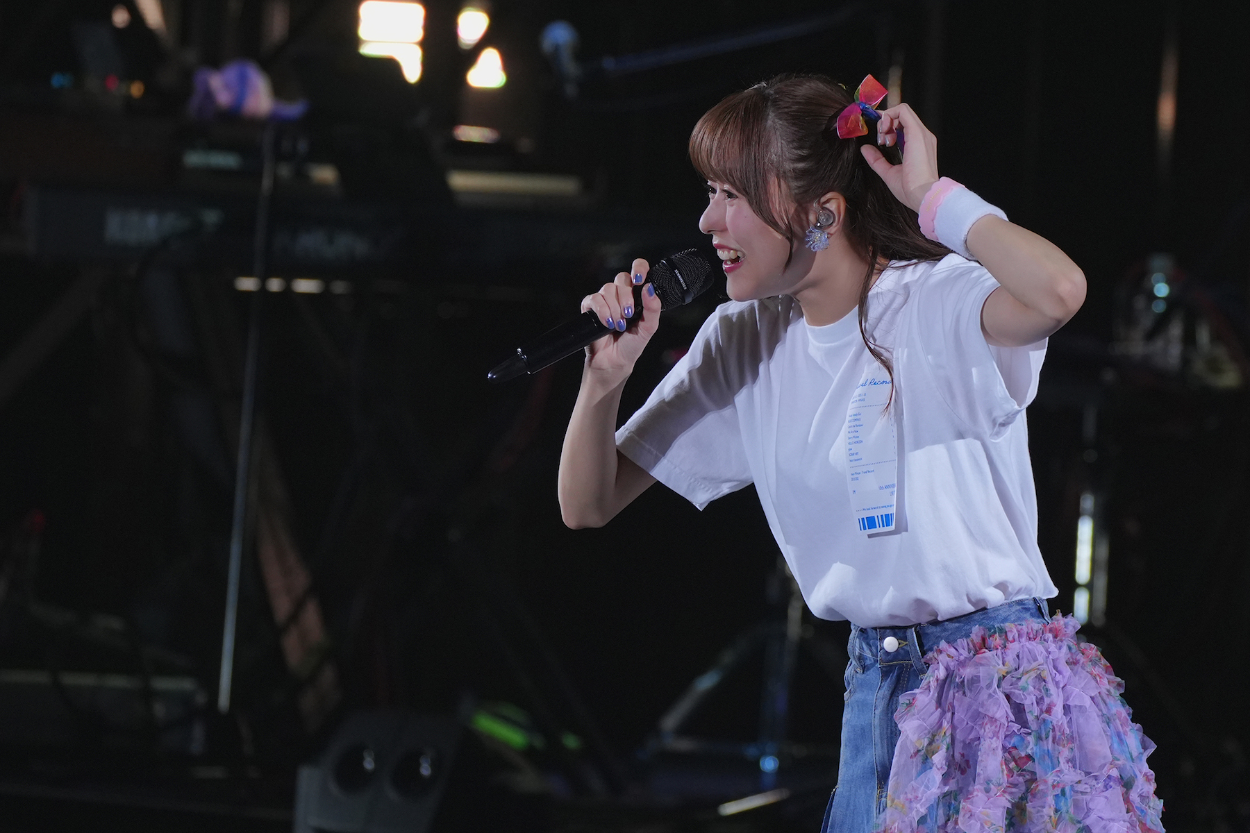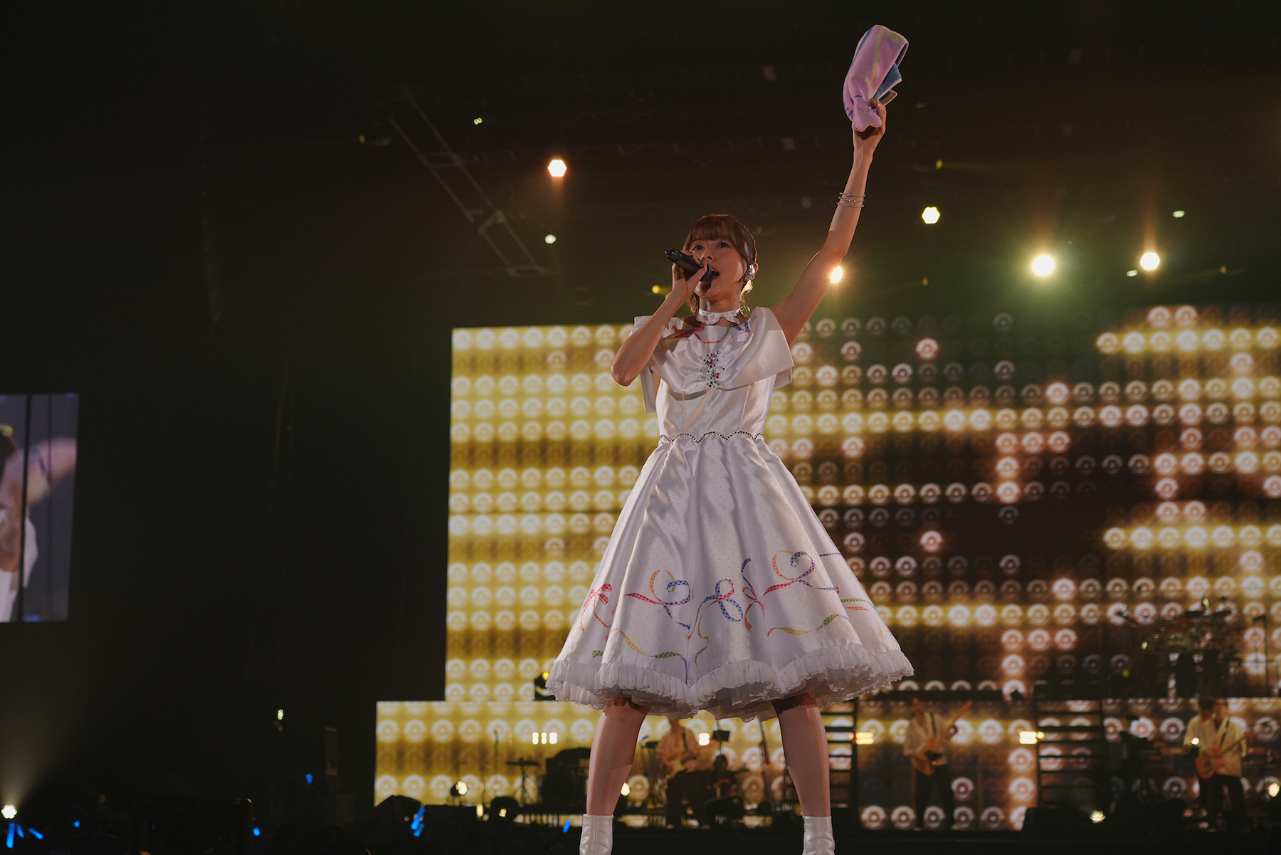 また、続く「ココロソマリ」はセンターステージで歌唱。じっと聴き入っていた観客のあたたかい拍手を一身に浴び、花道からメインステージに戻る道すがらには、後ろ歩きや横歩きをしながら観客にドレスを自慢する一幕も。「『ココロソマリ』は家族愛を描いた曲だけど、『みんな(観客)のことだな』と思うようになった」「みんなも家族なんだ、って」と、楽曲に込めた思いへの変化を感慨深げに口にする。