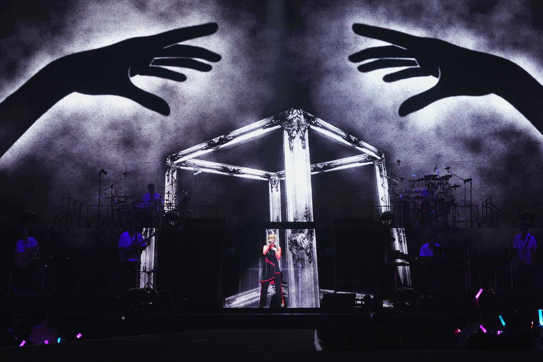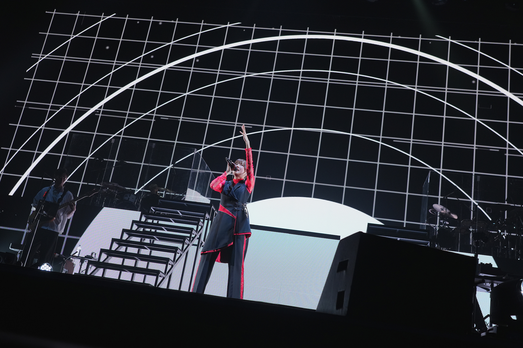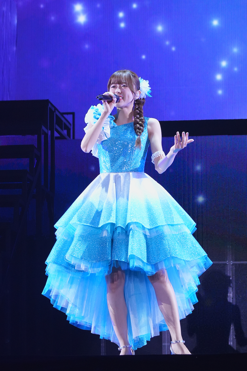 また、続く「ココロソマリ」はセンターステージで歌唱。じっと聴き入っていた観客のあたたかい拍手を一身に浴び、花道からメインステージに戻る道すがらには、後ろ歩きや横歩きをしながら観客にドレスを自慢する一幕も。「『ココロソマリ』は家族愛を描いた曲だけど、『みんな(観客)のことだな』と思うようになった」「みんなも家族なんだ、って」と、楽曲に込めた思いへの変化を感慨深げに口にする。