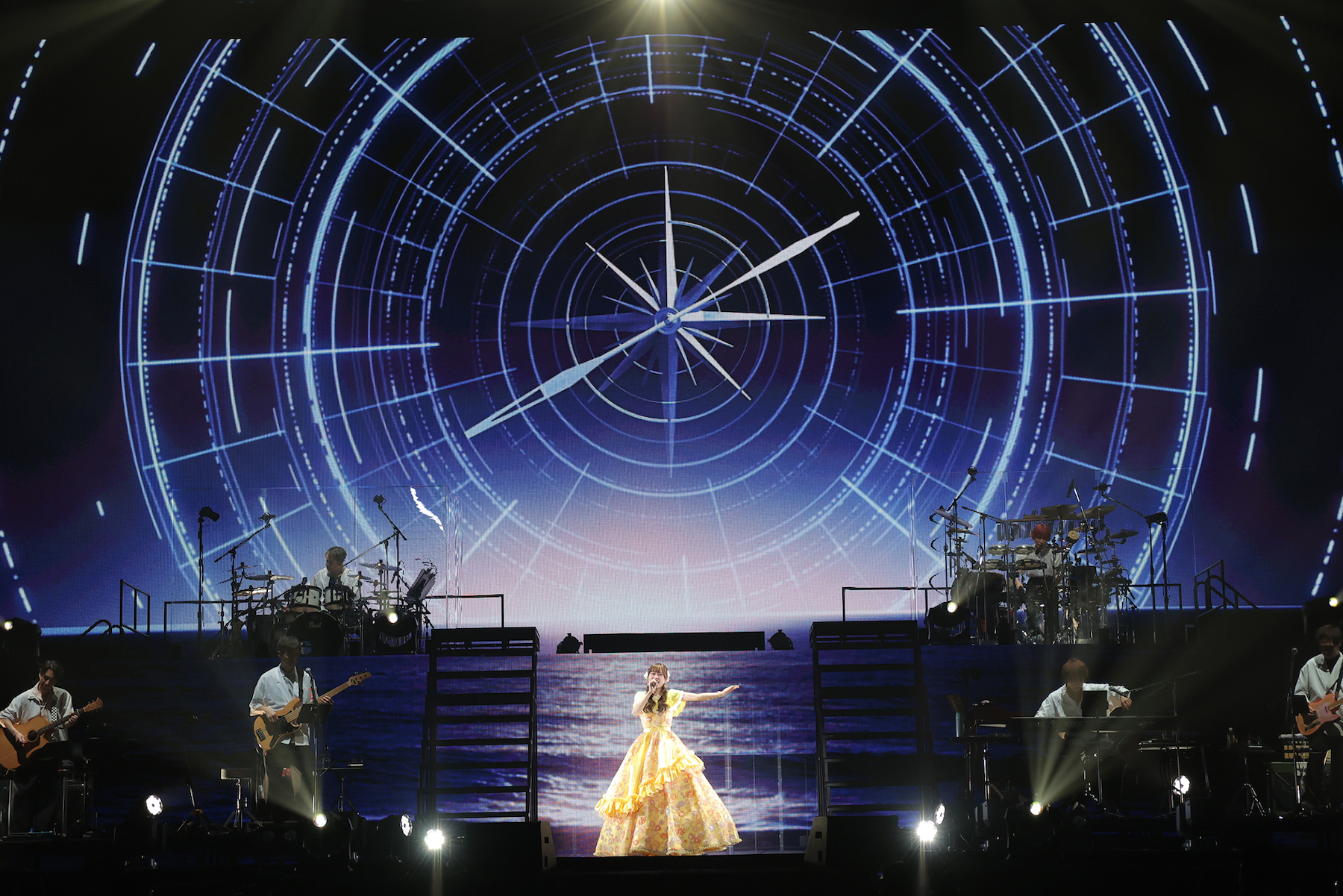 紗幕が降りたステージの向こうに黄色いドレス姿の水瀬が現れ、はじまったのは「BLUE COMPASS」。紗幕には水泡がぶくぶくと沸き、深海に漂っているかのような世界観のなかで披露された。「リリース当時は難しくて必死だった」とMCで語った同曲も、この日の水瀬は悠然と、堂々と歌い上げ観客を酔わせた。コロナ禍によって無観客で行われた5周年記念ライブを経て、当時のライブでは直接見せることができなかった演出で歌えたことへの喜びとともに、「みんなの目を見て歌えて、本当に嬉しかったです」と弾ける笑顔を見せた。