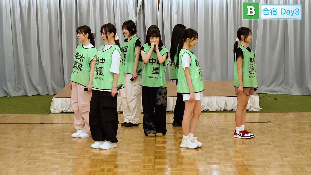 グループBでは、高月凛々が「明確に課題が分かった」と語り、マイクの持ち方や、ダンス中にマイクが当たるのが怖いという具体的な不安も共有されていた。その改善策として、チアーリーディングのような掛け声を追加することになり、チームとして“盛り上げ方”を作りにいく姿勢が見えてくる。そこへユーキも見学に訪れ、櫛橋成実が表情についてアドバイスを求める場面も。ユーキは実際のパフォーマンスを見たうえで、「大人っぽさを出してみる」「サビの一箇所だけちょっと違う表情をしてみる」と、すぐ試せる具体案を提示していた。途中、那須ほほみや針ヶ谷心らのメンタルが揺れる場面もあったが、それでもどう変えるかを言葉にして共有できていること自体が、チームの前進を感じさせる。