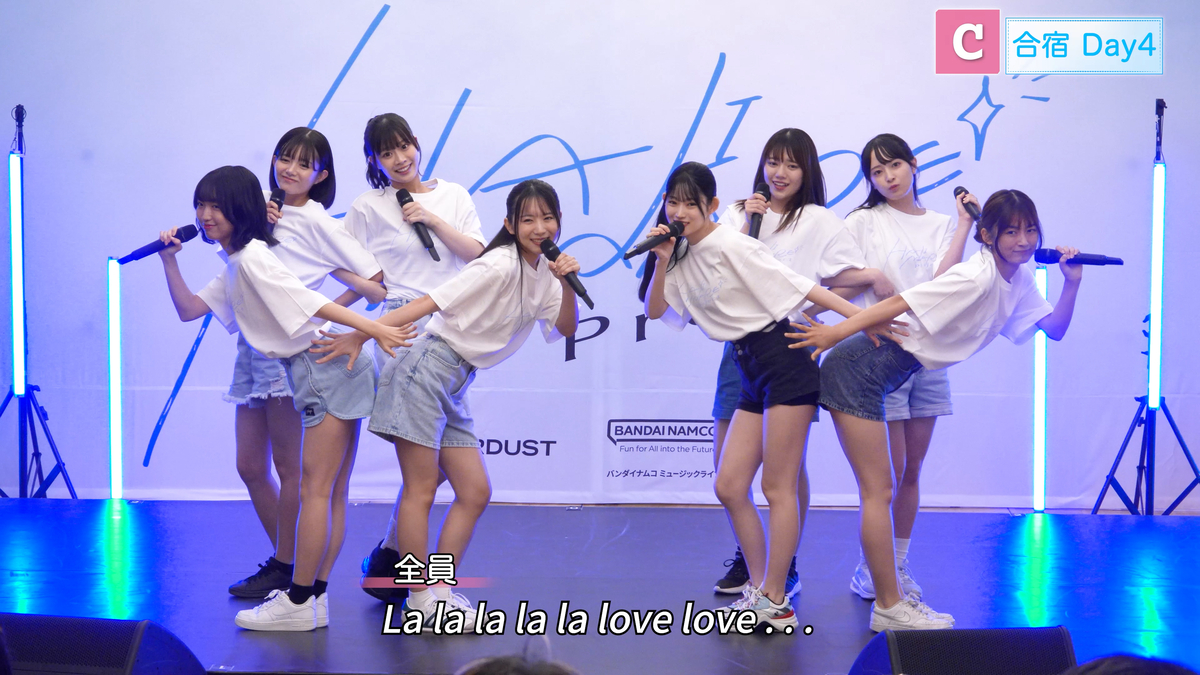 一方、合宿期間を通して笑顔が絶えなかったのが、AiScReamの「愛♡スクリ~ム!」に挑んだグループC。太田梨月が「個性にも注目してほしい」と語っていた通り、最終日はその個性が一気に前へ出たパフォーマンスだった。セリフパートでは、桜音ななのミルクレープ、白石るりの黒はんぺん、太田梨月の家系ラーメン、髙橋優衣の焼き鳥、臼井碧依のフランスパン、禾本珠彩のスイーツビュッフェ、中沢結乃のブラックペッパー、山本菜摘のひつまぶしと、好きなものが飛び交って会場を沸かせる。明るさや遊び心を前面に出しつつ、それがチームの魅力としてはっきり伝わるステージだった。