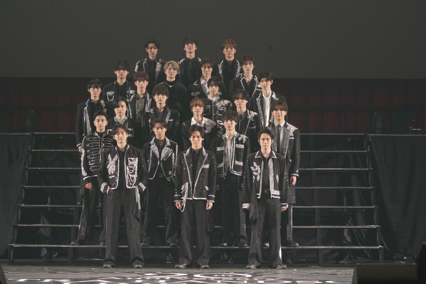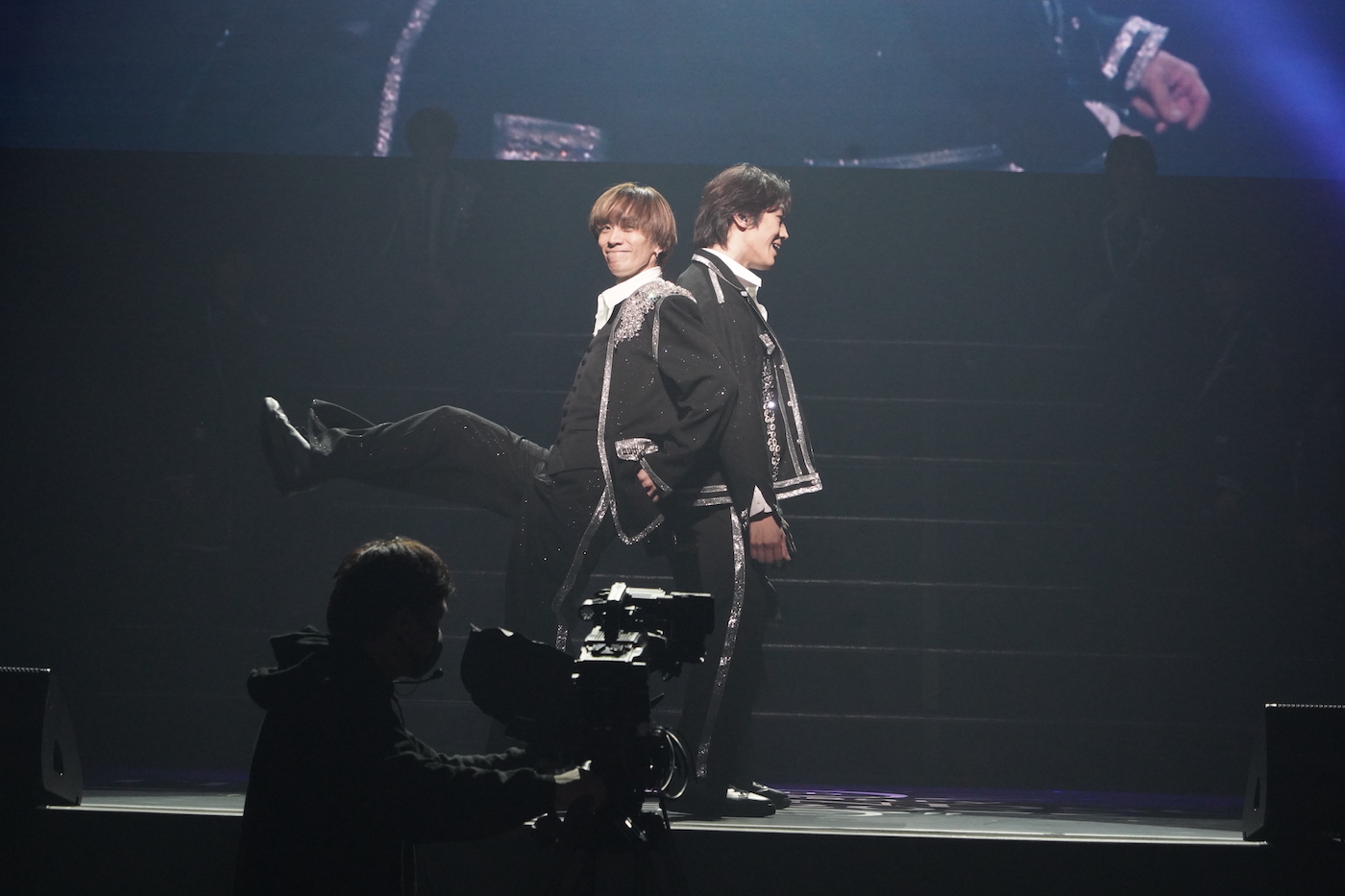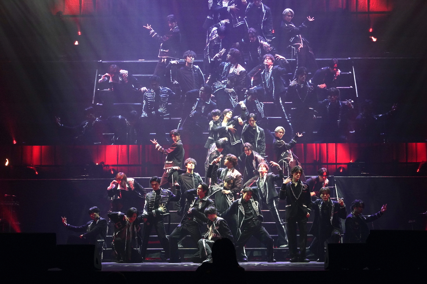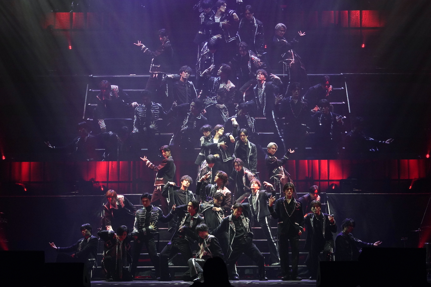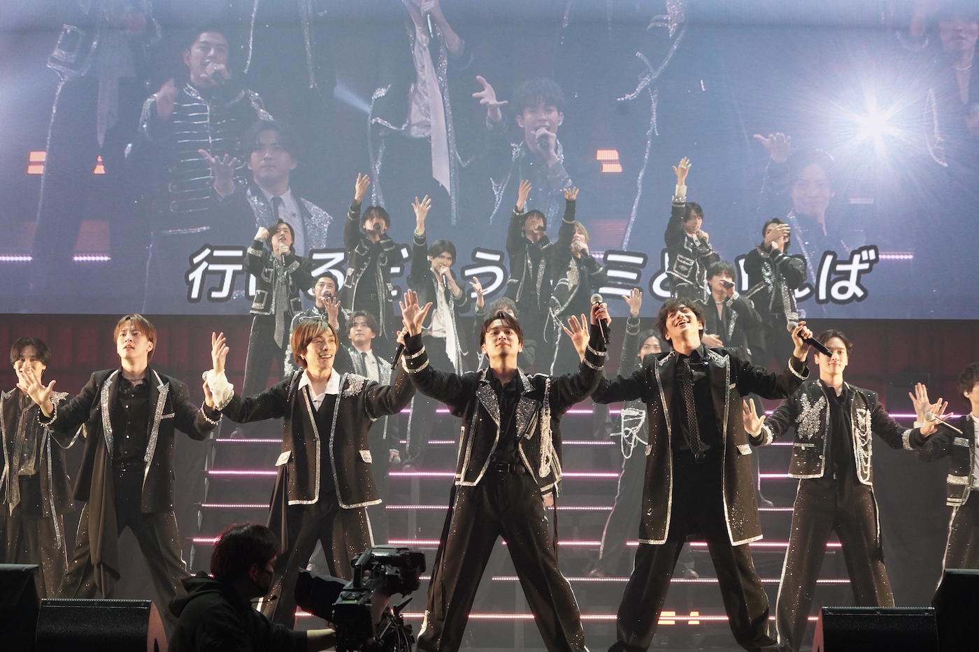 迎えた本番。12月28日の最終公演、時計の針が時を刻む映像が流れ、ステージに水田が登場した。スクリーンに浮かぶカードが1枚ずつめくられ、22名のハンサムたちが次々と登場していく演出は、今回と同じくパシフィコ横浜 国立大ホールにて開催された2012年公演を想起させる。そんな2012年公演でもオープニングを飾った「THIS IS THE TIME」で始まりを告げると、過去公演ではユニット曲として場を盛り上げてきた「THRILL」を全員で披露。大人数でのパフォーマンスは炎の演出も相まって迫力満点だ。そこから、平間の伸びやかな歌声からスタートした「ベストスマイル」は、一転して爽やかな雰囲気に。全員が“ベストスマイル”を浮かべ、呼応するように客席も笑顔で満たされていった。