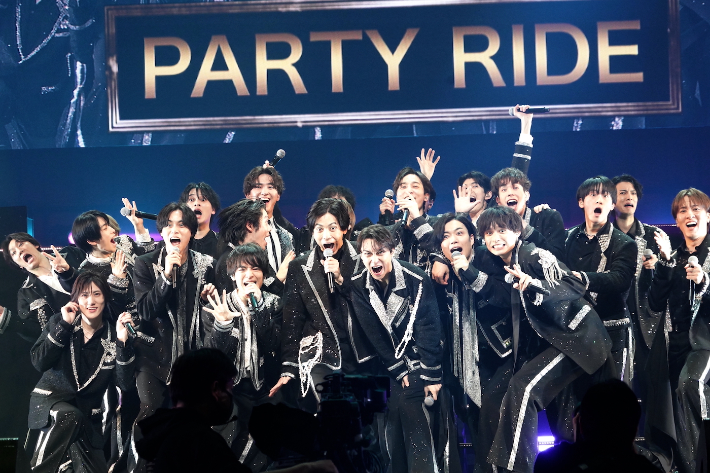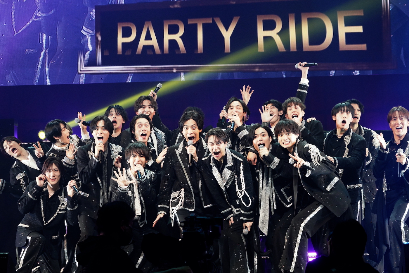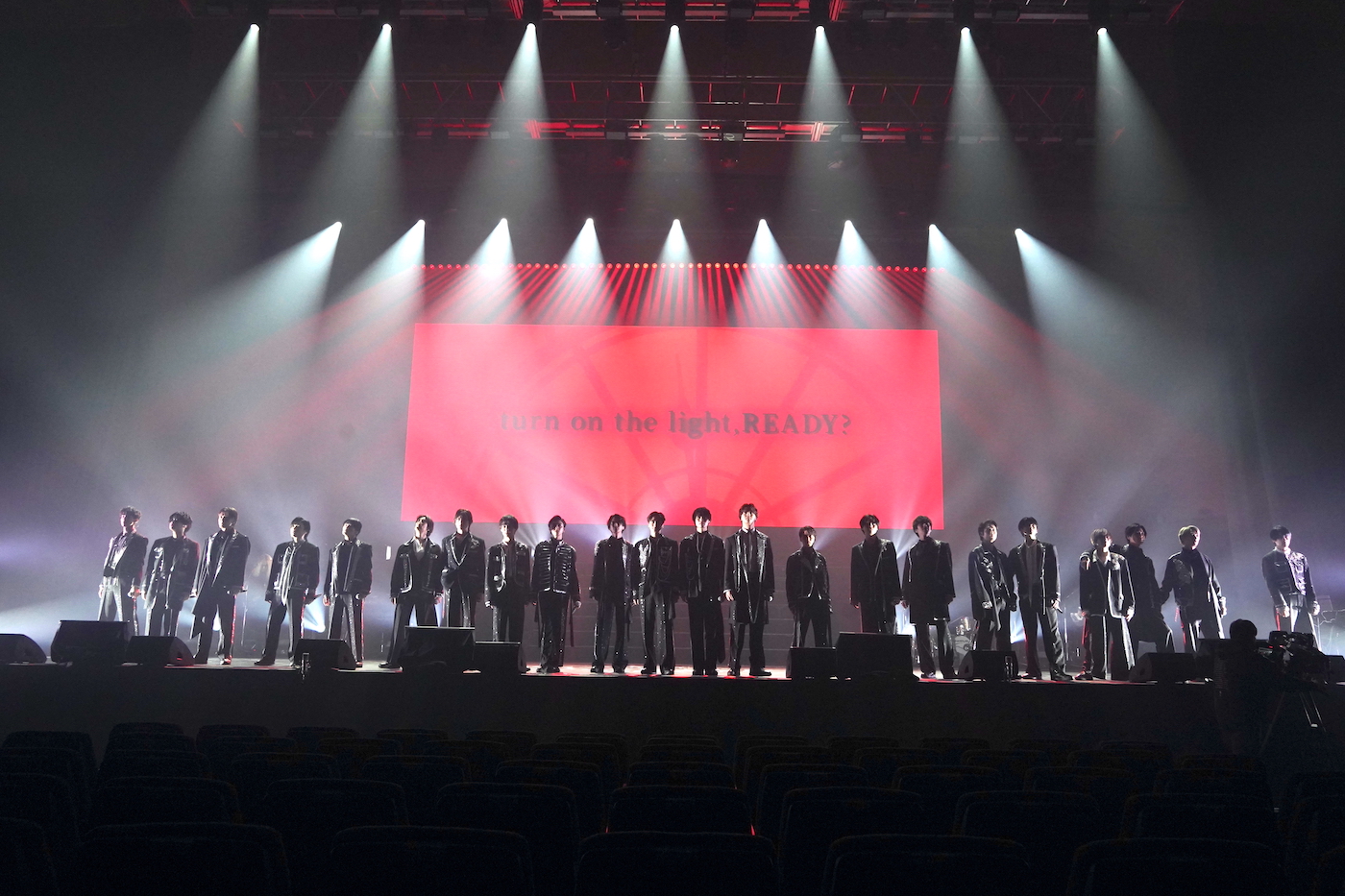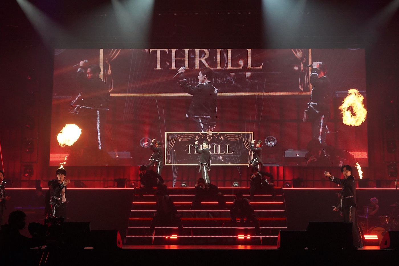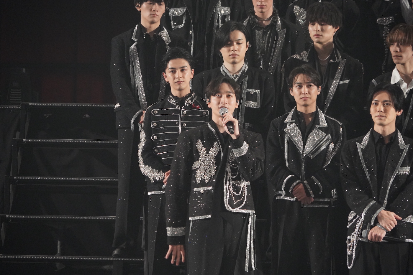 迎えた本番。12月28日の最終公演、時計の針が時を刻む映像が流れ、ステージに水田が登場した。スクリーンに浮かぶカードが1枚ずつめくられ、22名のハンサムたちが次々と登場していく演出は、今回と同じくパシフィコ横浜 国立大ホールにて開催された2012年公演を想起させる。そんな2012年公演でもオープニングを飾った「THIS IS THE TIME」で始まりを告げると、過去公演ではユニット曲として場を盛り上げてきた「THRILL」を全員で披露。大人数でのパフォーマンスは炎の演出も相まって迫力満点だ。そこから、平間の伸びやかな歌声からスタートした「ベストスマイル」は、一転して爽やかな雰囲気に。全員が“ベストスマイル”を浮かべ、呼応するように客席も笑顔で満たされていった。