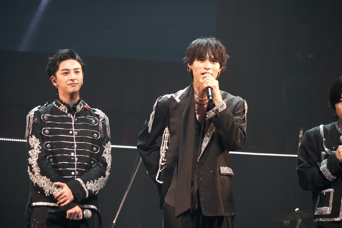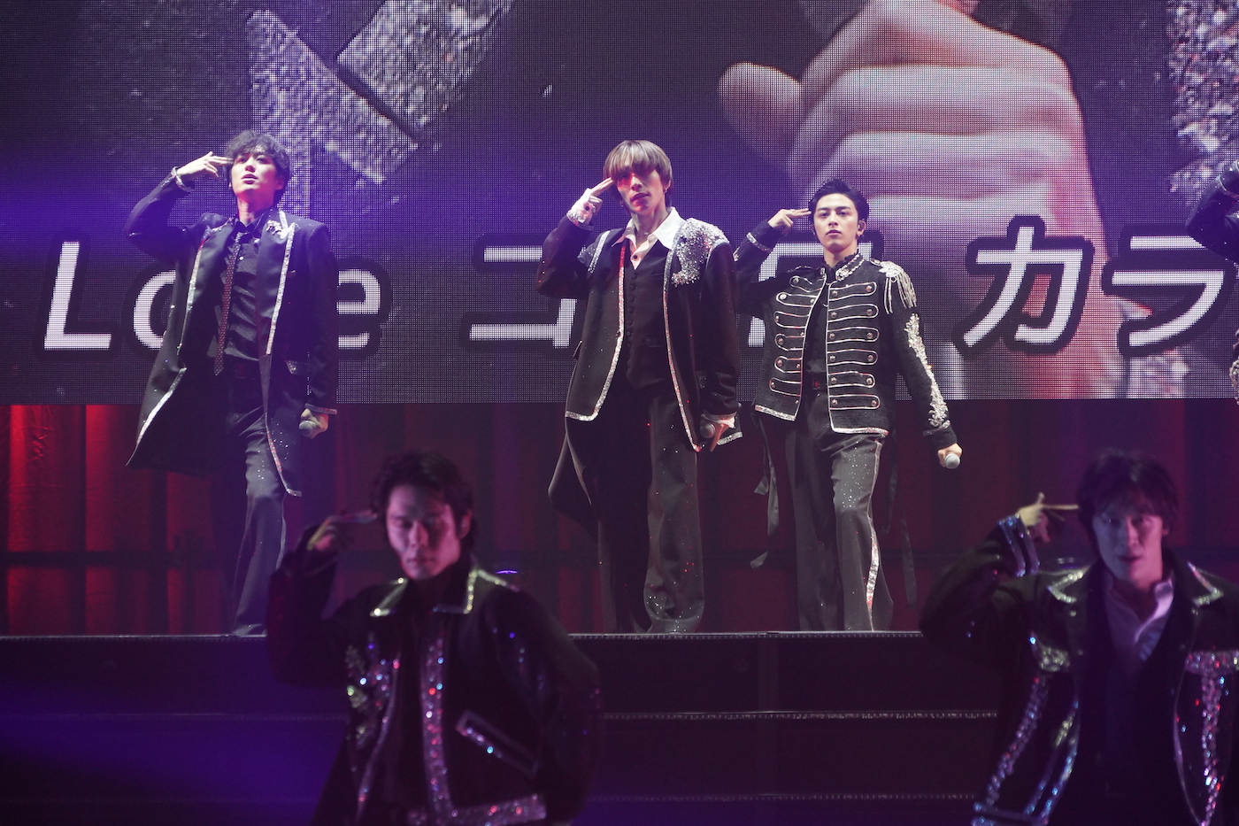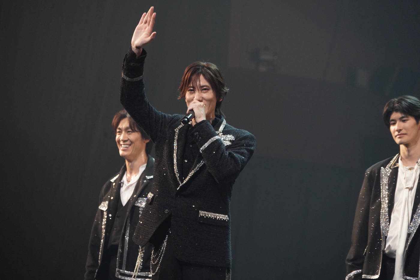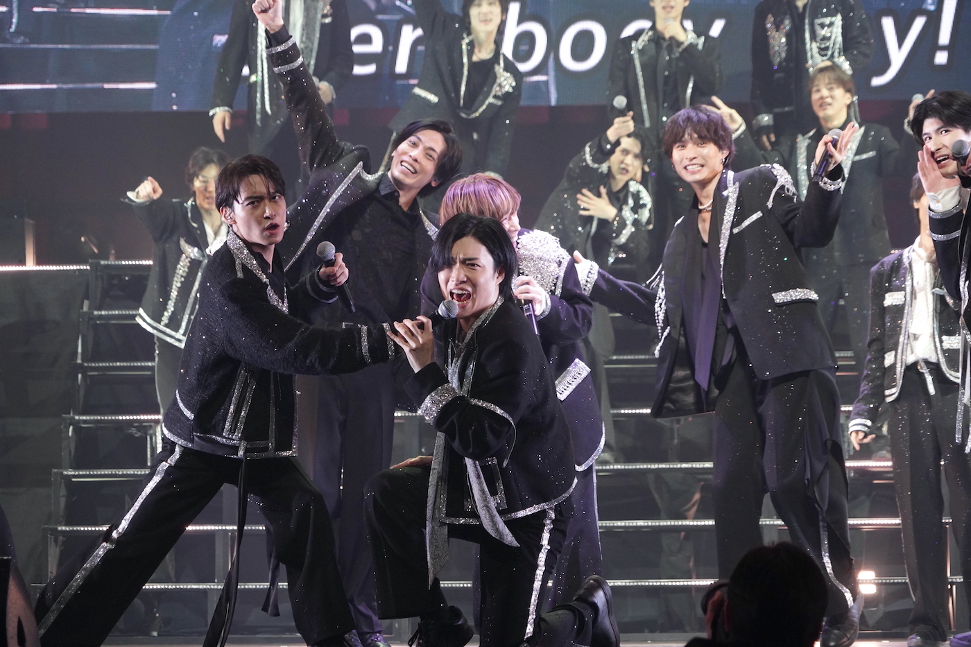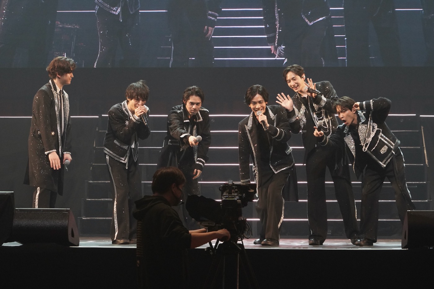 そして、最終公演にはさらなるサプライズが待っていた。ファンからのリクエストで1位を獲得した「キミノリズム」は公演ごとに異なるメンバーで届けられており、今回は小関、松岡、松島、水田によるパフォーマンス……と思いきや、ステージには5人目のメンバーが登場。後ろ向きに立っていた彼が振り返ると、割れんばかりの歓声が響いた。歴代ハンサムメンバーの神木隆之介だ。嬉しさから抱き合った5人は、神木をセンターに据えてステージ前面へと移動し、〈君の手をそっと握った〉で小関と神木が手を繋ぐなど、笑顔を弾けさせる。歌い終えた神木は、自身も過去に『ハンサムライブ』のステージに立った時のことを思い出したと語り、最後はファンからの大歓声を受けて「幸せだよ!」と笑みを見せた。