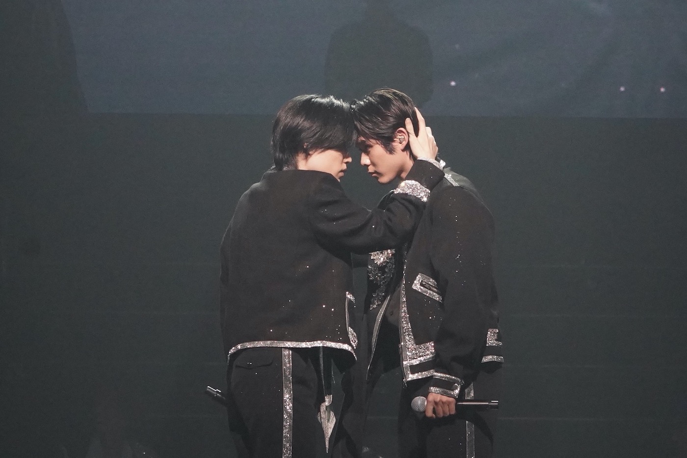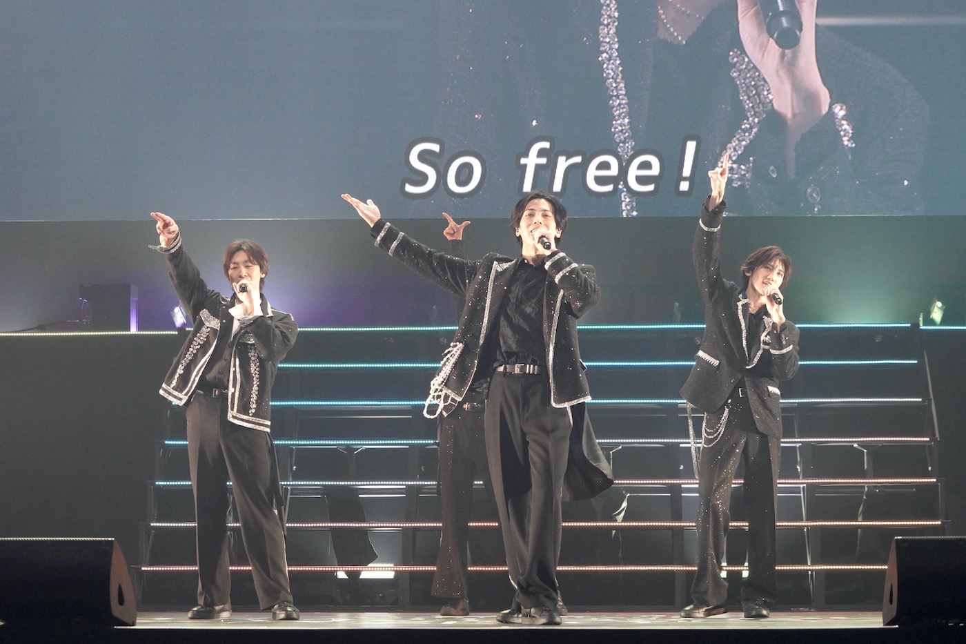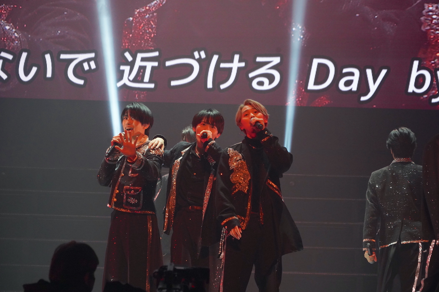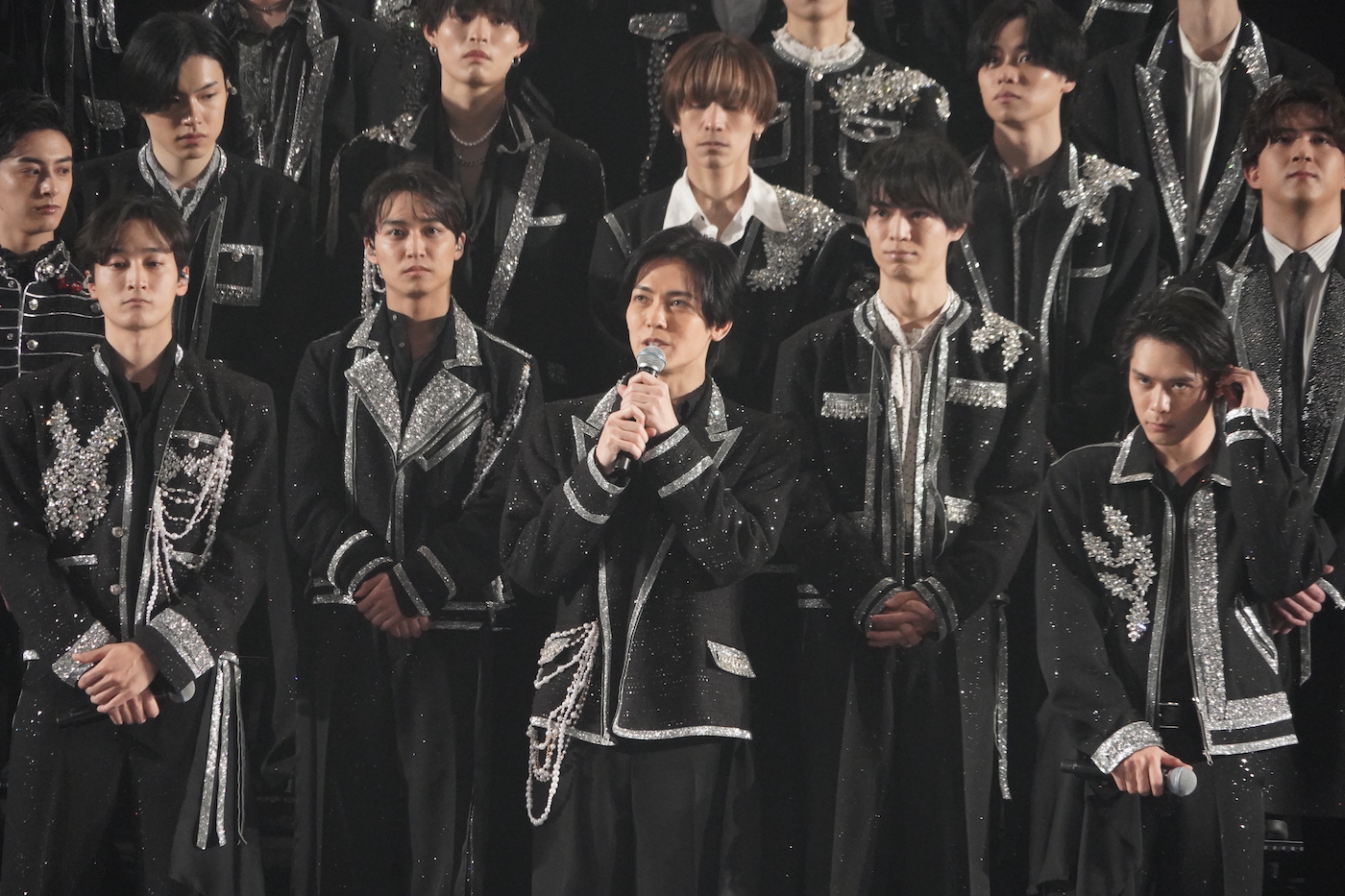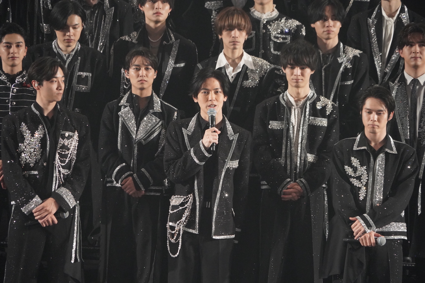 そして、最終公演にはさらなるサプライズが待っていた。ファンからのリクエストで1位を獲得した「キミノリズム」は公演ごとに異なるメンバーで届けられており、今回は小関、松岡、松島、水田によるパフォーマンス……と思いきや、ステージには5人目のメンバーが登場。後ろ向きに立っていた彼が振り返ると、割れんばかりの歓声が響いた。歴代ハンサムメンバーの神木隆之介だ。嬉しさから抱き合った5人は、神木をセンターに据えてステージ前面へと移動し、〈君の手をそっと握った〉で小関と神木が手を繋ぐなど、笑顔を弾けさせる。歌い終えた神木は、自身も過去に『ハンサムライブ』のステージに立った時のことを思い出したと語り、最後はファンからの大歓声を受けて「幸せだよ!」と笑みを見せた。