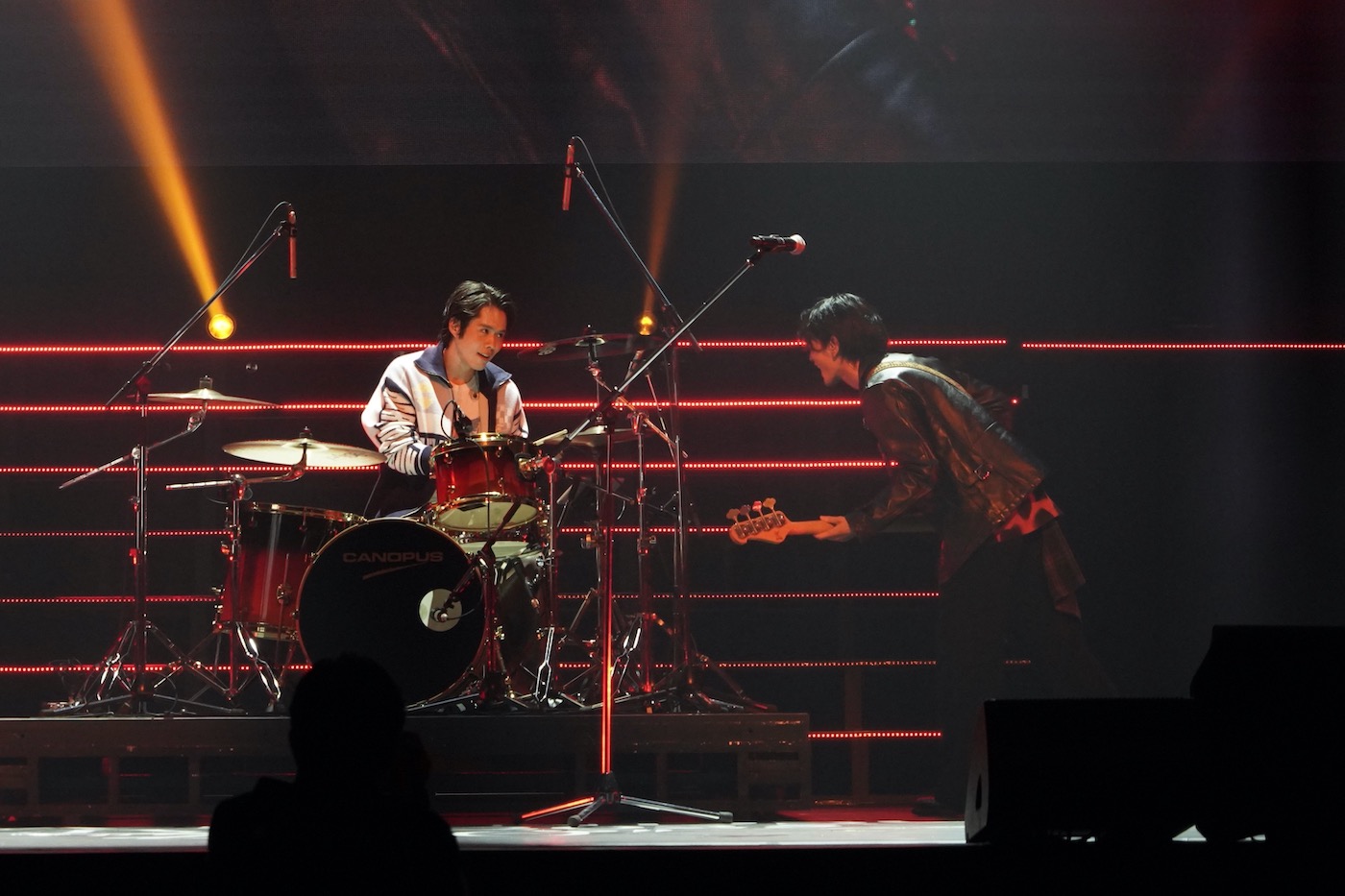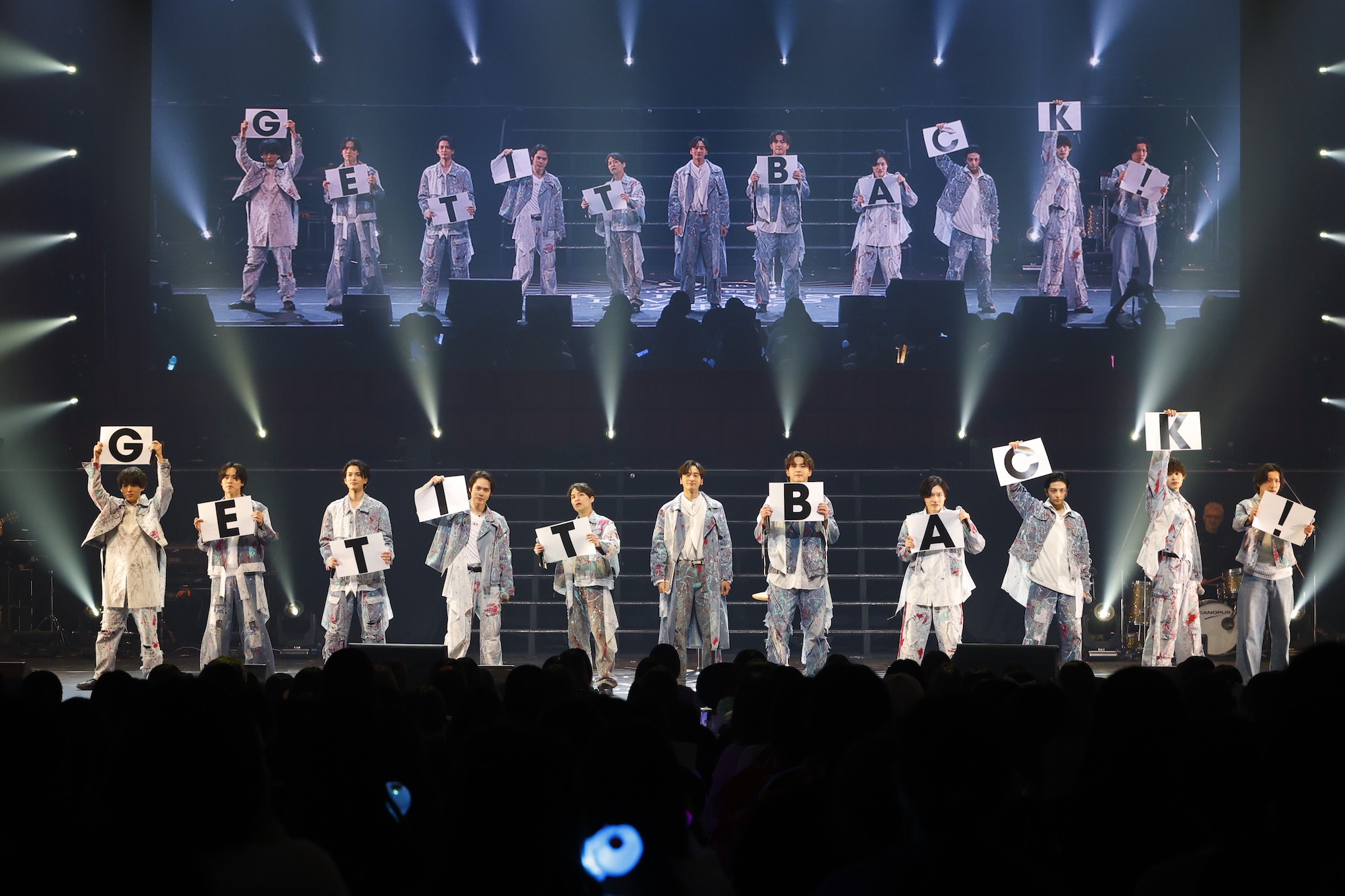 伝統企画「キュンファイDEATHマッチ」を経たライブ後半戦も、ハイライトの連続だった。メンバーのみで曲前半の演奏と歌唱を手掛けた「君がいれば」では、東島がピアノ、本島がギターを弾き、山崎が涙を流す一幕も。繊細な歌声が紡がれた「春の花」を経て、コロナ禍の葛藤と孤独を思わせる芝居パートから、メンバーが当時の想いを綴って制作した「GET IT BACK!」へ。歴代ハンサムメンバーも含めた全員がステージに集結して始まった「Feel The Same」は、歌い出しのスポットライトが照らす先は空白だったが、きっと“全員”によるパフォーマンスだったはず。メンバーは客席に降りて、ファンに笑顔を振りまいていった。