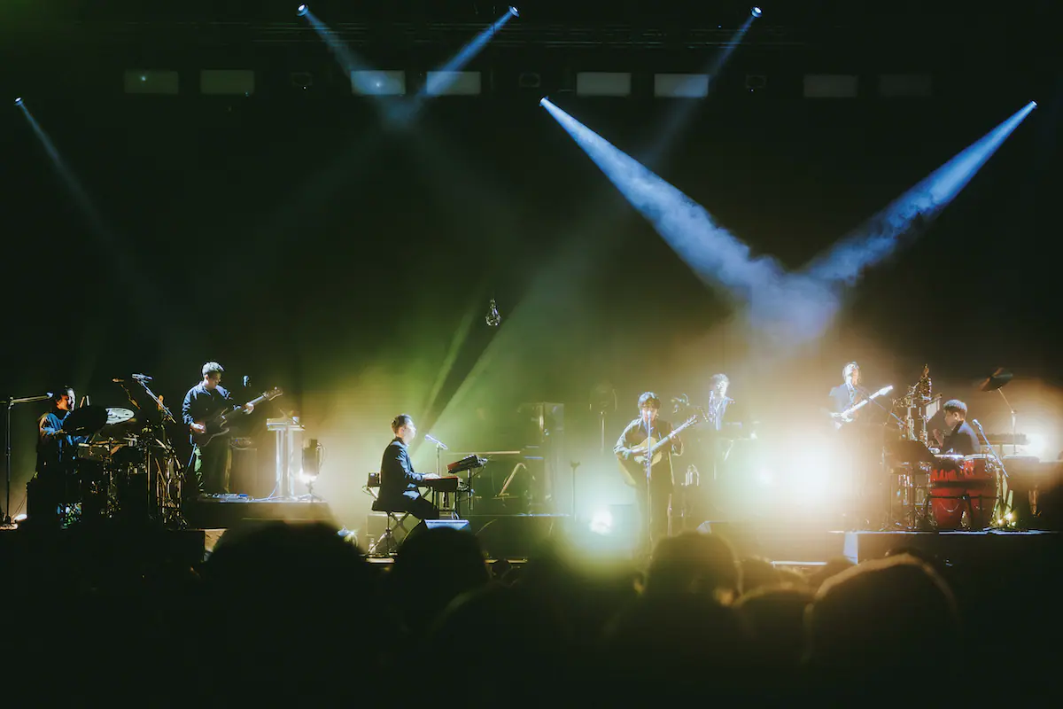菊池はステージの後ろにあるピアノと手前に置かれたキーボードを曲によって弾き分ける。フュージョン風の鳴りを感じた「近頃」は、のっけから朝田のギターが絶好調。火を吹くようなサウンドで景気づけていた。続く「コーラ・バナナ・ミュージック」がいきなりヤバい。コンガを大胆にフィーチャーしてアフロファンクへと化けたこの曲は、カラフルな照明とともに踊れる前半のハイライトだろう。いつもより幾分リズミカルに感じるカントリー調の「Emptyman」など、パーカッションを加えた編成がライブの冒頭から新鮮な風を呼び込んでいる。