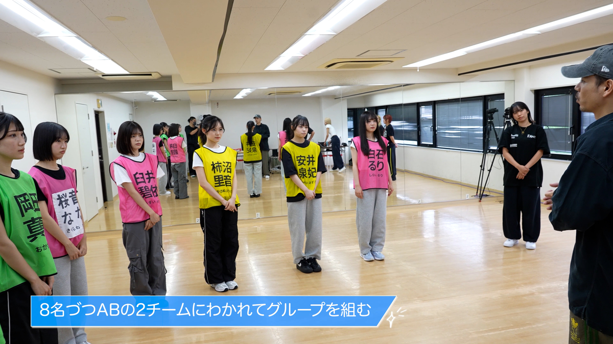 Aチームは、臼井碧依、岡田真夏、柿沼里音、桜音なな、白石るり、那須ほほみ、針ヶ谷心、安井泉妃。レッスン序盤から厳しい指摘が飛び、コレオグラファーのeatは「家に帰って練習やってる?」とストレートに問いかける。合宿ではその場で必死に食らいつく姿が映っていたが、最終審査はそれだけでは足りない。家に帰ってからどれだけ復習し、積み上げてきたか、各自の準備がそのまま差になる。だからこそAチームは輪になって話し合い、空気を立て直そうとする。
