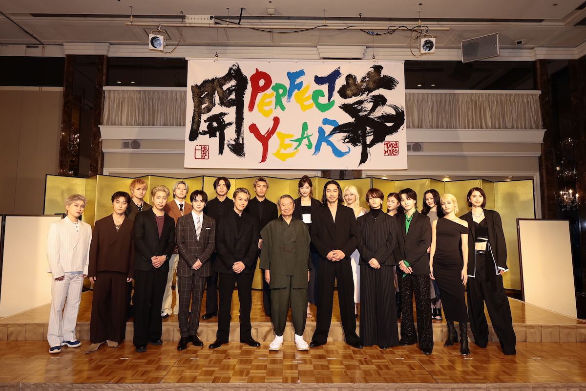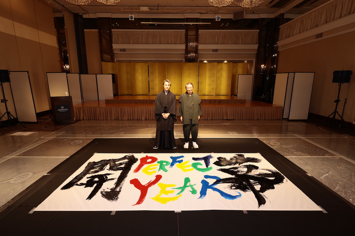会見前にはSYOINGアーティスト・吉川壽一とEXILE TAKAHIROによる書道パフォーマンスがあり、TAKAHIROは「僕にとっても2026年初めての書初めとなるのですが、吉川大先生とご一緒させていただくということで、恐縮ながら精一杯心を込めて書かせていただきたいなと思っております」、吉川は「今年は午年ということで馬力ある形で、上昇気流を捕まえて書きたいと思います」と意気込んだ。吉川は時折「やっ!」と声を出しながらのパフォーマンスで、TAKAHIROも「先生、迷いがないですね」と感心の様子。息を吞むような痺れる緊張感の中、赤、黄、緑、青、黒のインクを使用した“PERFECT YEAR開幕”の文字が書き上げられる。2人のインスピレーションで書き上げられた作品は最後に金粉で飾り付けられ、『PERFECT YEAR』の開幕にふさわしい華やかで勢いのある一枚となった。