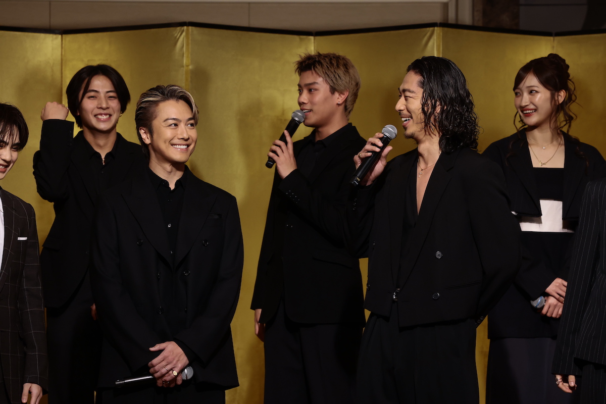 会見にはオフィシャルファンクラブから当選したファンも駆け付けた。書き上げられたばかりの作品が金屏風の上部に飾られた豪華なセットに、シックな衣装に身を包んだメンバーが登壇。中島の「LDH大好きです! よろしくお願いします!」という清々しい挨拶に、後の小川も「私もLDHが大好きです!」と続いた。後段のセンターに立った岩城は「ここに立った瞬間に思ったんですけど、僕がセンターで本当にすみません。AKIRAさんとTAKAHIROさんが映る時には小さくなります」と恐縮の様子。陣も「気抜かれへんな(笑)」と笑った。新成人の岡尾は「個人的なんですけど、先日成人いたしましたので今回参加させていただいてます。今日はとにかく笑顔でやらせていただきます」とフレッシュに挨拶した。