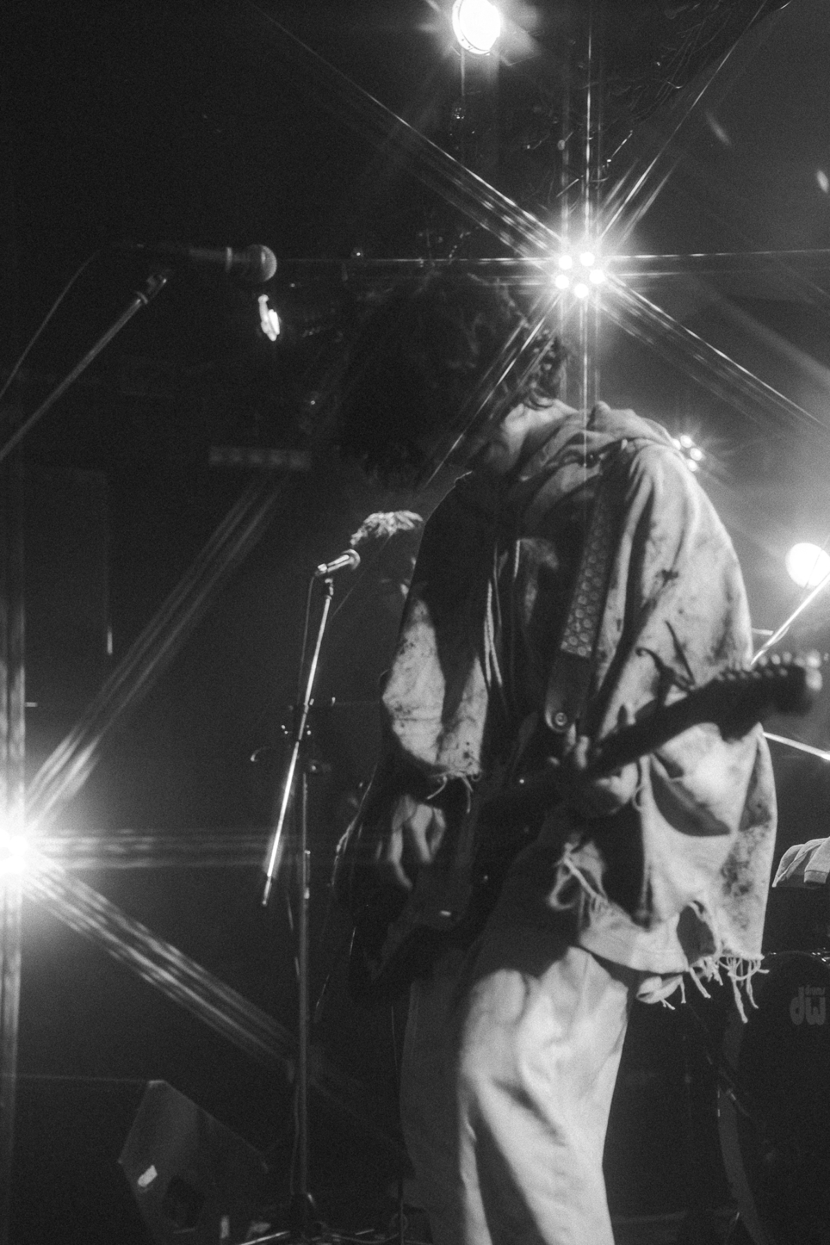 映秀。が新代田FEVERでライブを行うのは今回が初めてだ。「音楽とともに新年をみんなで祝おう」をテーマに、映秀。が2時間余りのセットリストに詰め込んだのは22曲+@。前半は「残響」「砂時計」といったミッドテンポの楽曲を中心とした、MCでの言葉を借りれば「緊張感あるセトリ」で、後半は声、身体を動かして“フィーバー”する「喝采」「東京散歩」といったアップテンポな楽曲が中心に並んだ。そして、「+@」というのはライブタイトルの「新年FEVERしまSHOWTIME!!」からインスピレーションしたと思われるグルーヴィーな短いバンドセッションで、〈ハッピハッピニューイヤー〉〈おめでとサンキュー〉といったこの日限定(もしかしたら来年も?)のリリックに、そのまま1曲目の「脱せ」へと繋げる、言わば0曲目に位置付けられる楽曲だ。2025年から“脱する”という意味を込めた選曲なのではと思わせるほどに、〈今日から脱せ〉というストレートなメッセージがライブハウスを突き抜けていく。