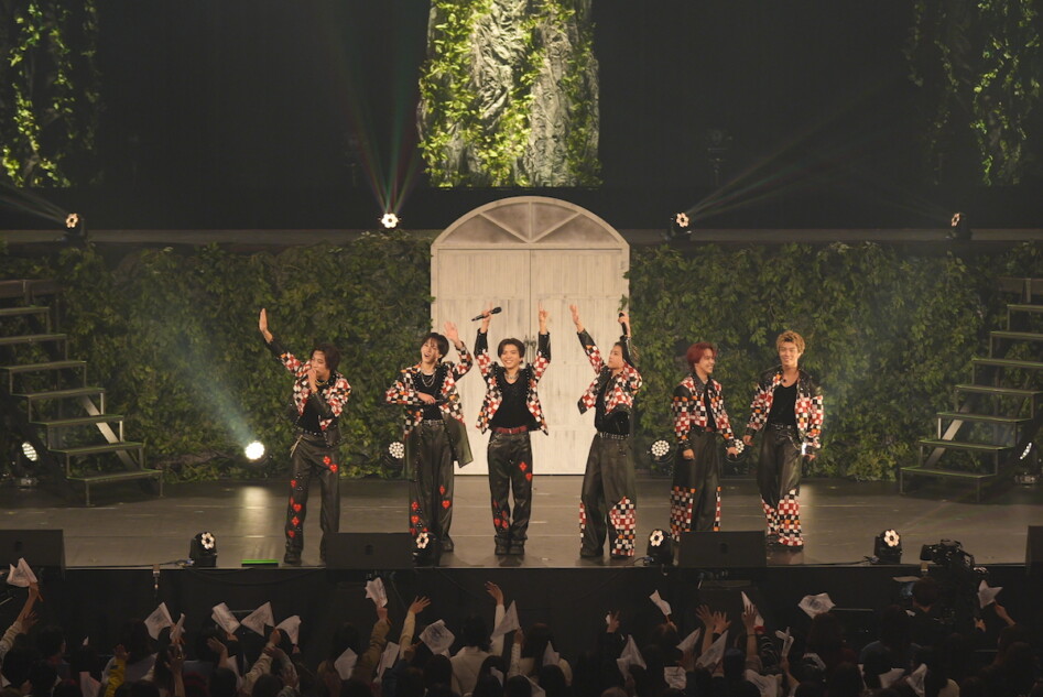 開演時間となり、案内人によるナレーションが流れた。「“結末はいつも自分の手の中にある”というメッセージを頼りに、島に魅せられた6人が理想の島を作ることに挑む」という“Wonder Island”のコンセプトが説明された後、本ツアーのテーマ曲「Wonder Island」のカーニバルのようなイントロが響いた。2階ステージに岩城星那、中村竜大、山田晃大、岡尾真虎、百田隼麻、難波碧空の6人が登場。中盤で後ろに倒れて姿を消したと思ったら、「さあ始めよう。“Wonder Island”」というアナウンスが聞こえ、1階ステージに置かれた扉から6人が再登場。「Wonder Island」の歌詞にある通り、いきなり最高潮の盛り上がりを見せる。ダンスパートでは百田のアクロバットが鮮やかに決まった。
