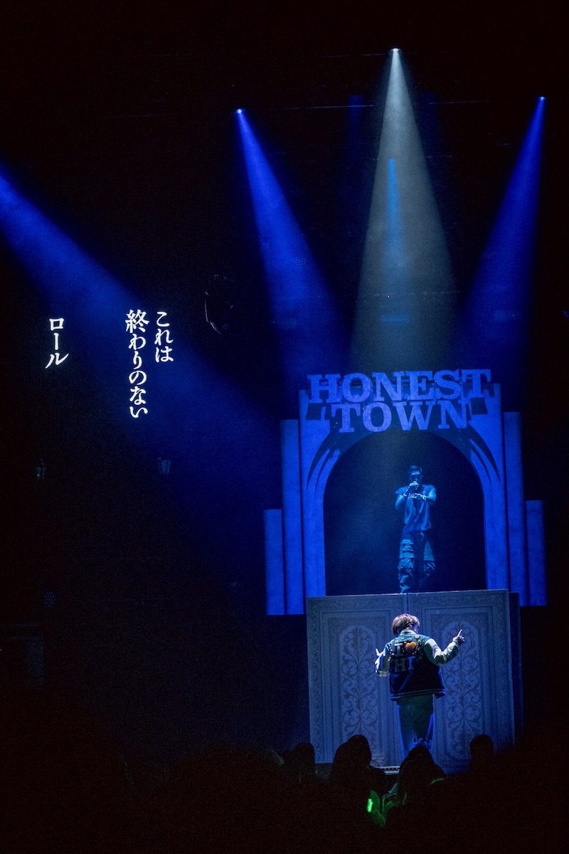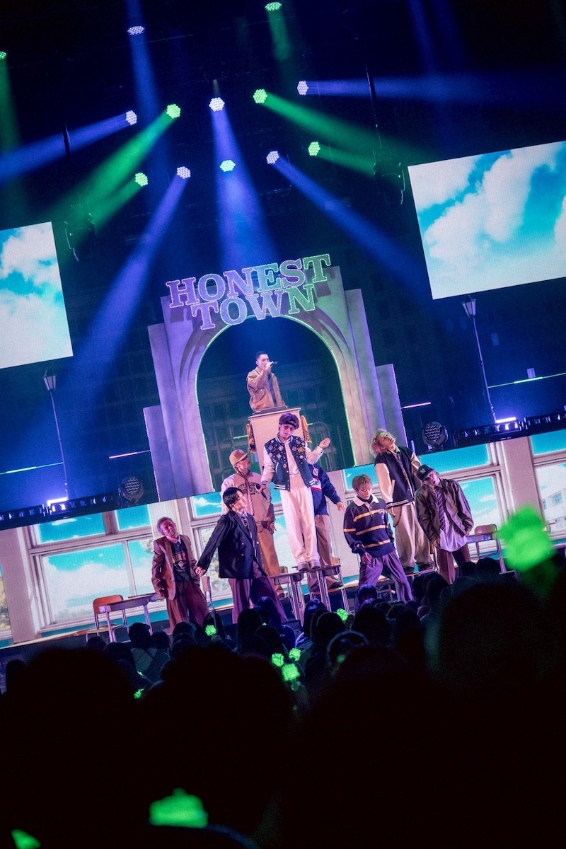 その世界観は開演前の映像から徹底されており、英語で「オープニングセレモニーが始まります」とアナウンス。リリース情報や、グッズの情報などもニュース番組風に紹介されていた。そして始まったオープニング映像では「“HONEST TOWN”のみんなの広場から中継だ! 新しいリーダーの登場だ!」と煽るようなアナウンスが。