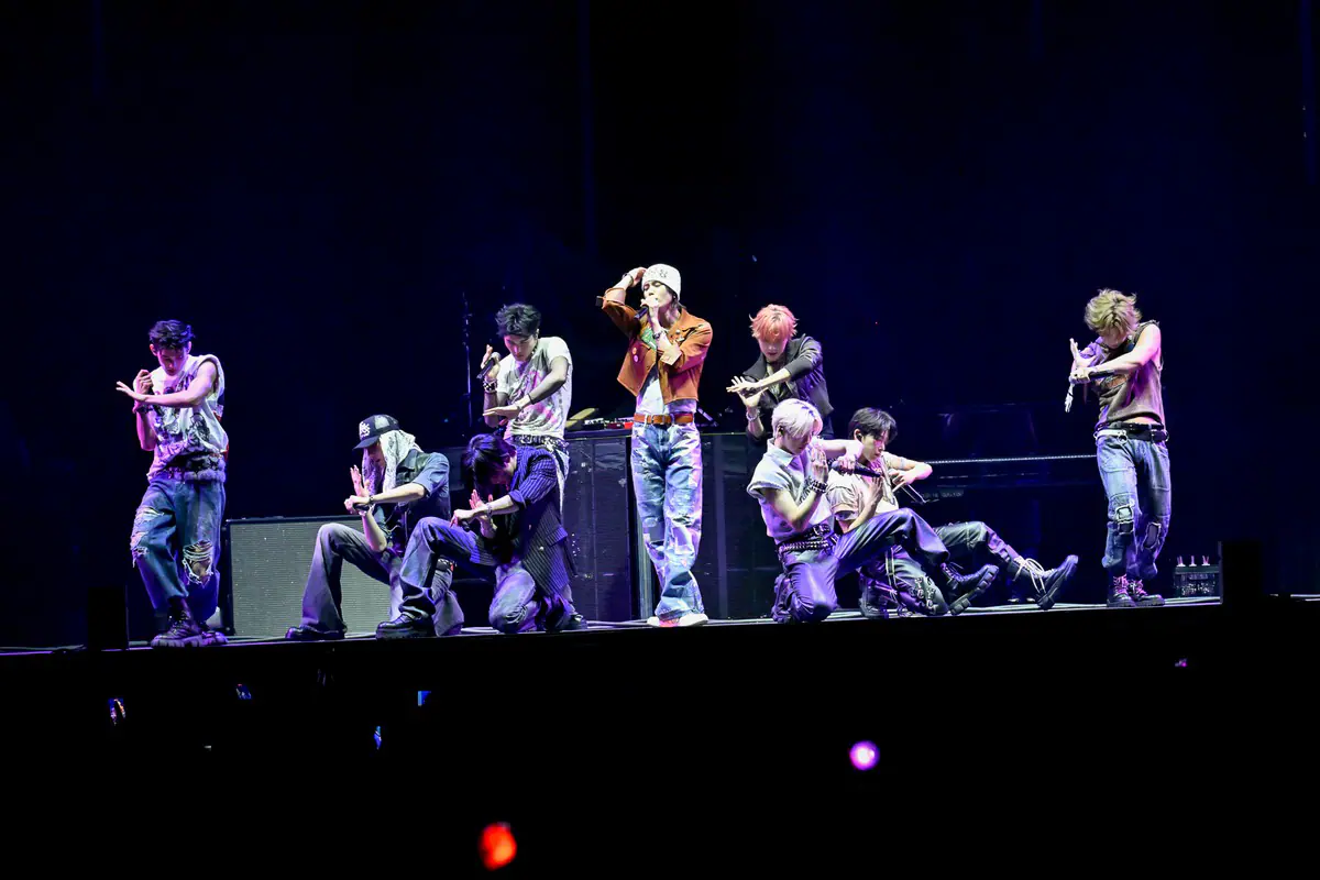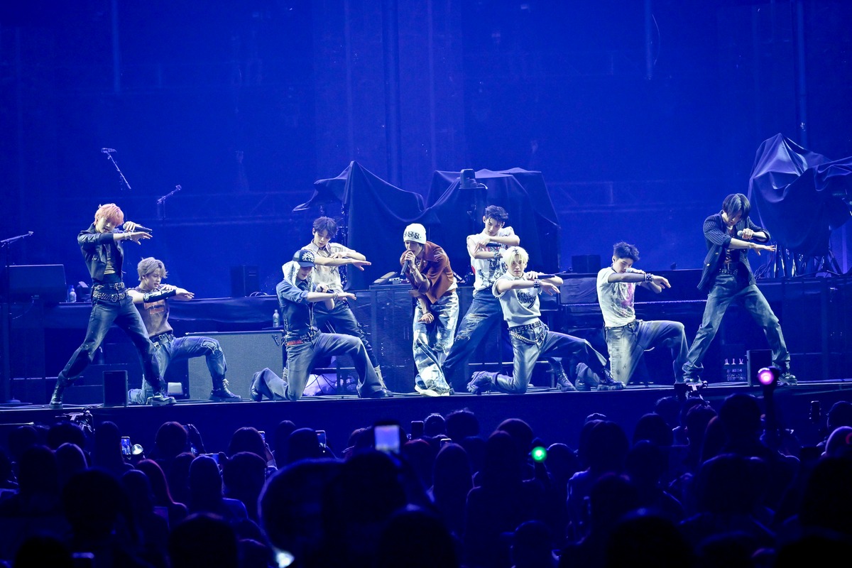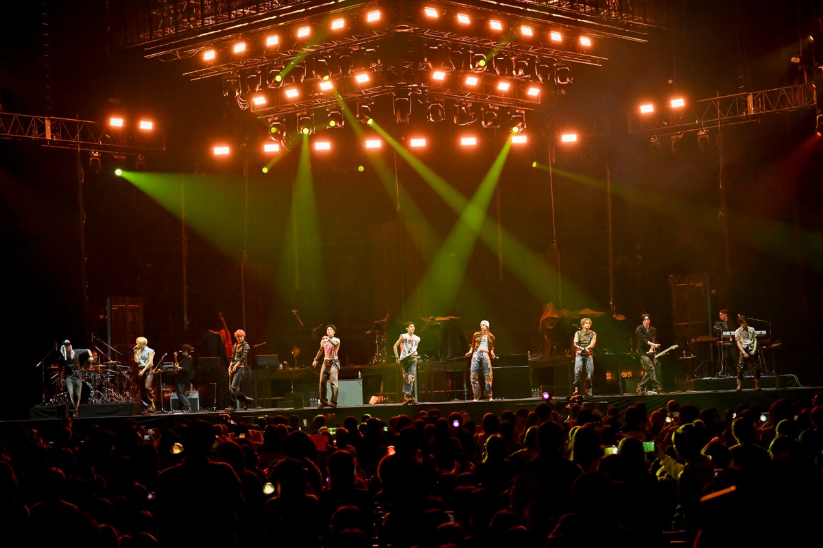 客電が消え、&TEAMのロゴマークがモニターに映し出されると、ペンライトの光がところどころに光りだし、歓声が上がる。広いステージに横一列に並んだ9人の姿が光と共に浮かび上がり、始まった1曲目は「Back to Life(Japanese ver.)」。迫力ある歌い出しで強く印象付ける。大音量の生バンドの演奏にのせて、激しいダンスと独自の世界観を開始早々に突き付けていった。ボトムスはデニムで揃え、トップスは個々の個性を活かしたロックテイストの滲む衣装がバンドサウンドにもマッチしている。
