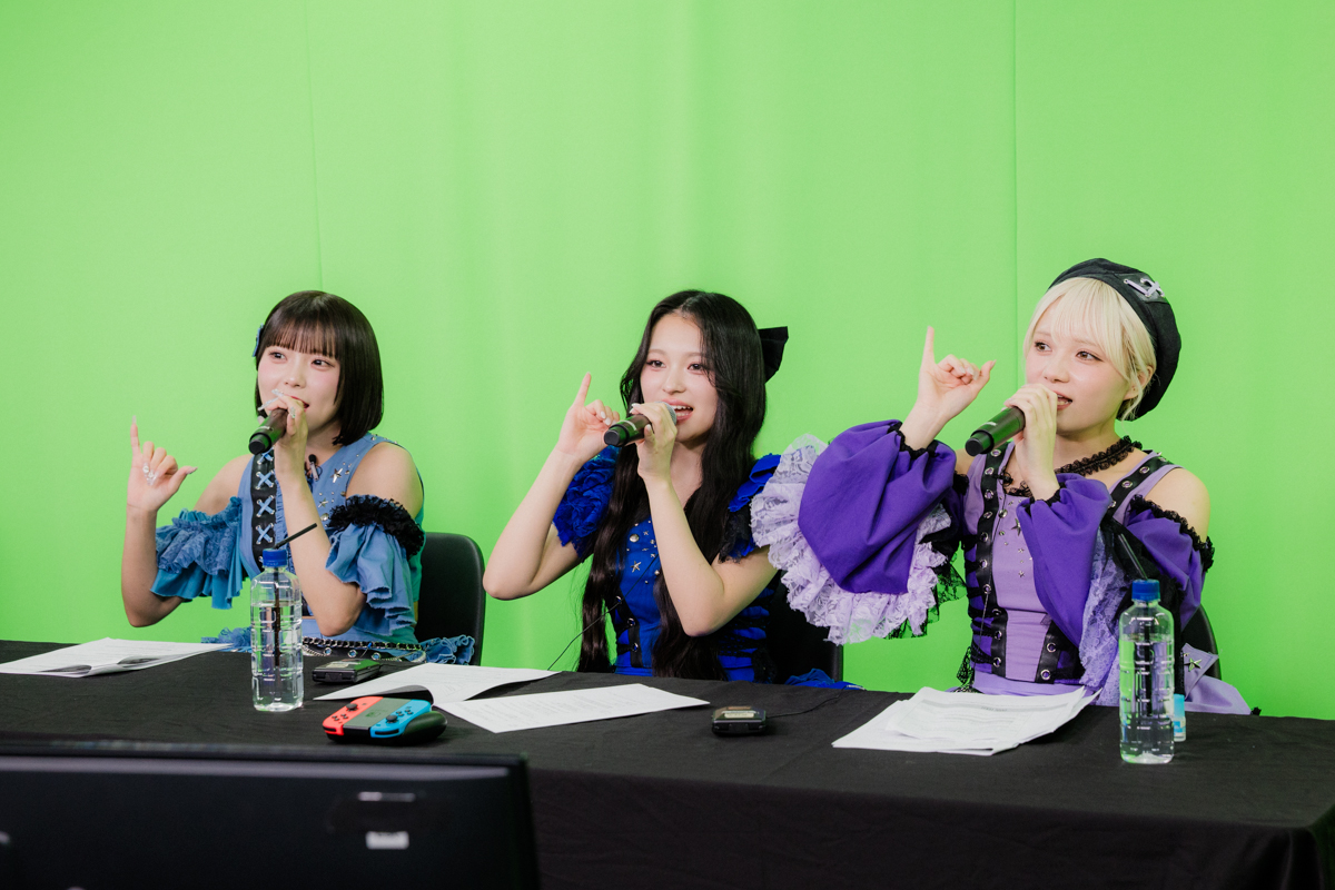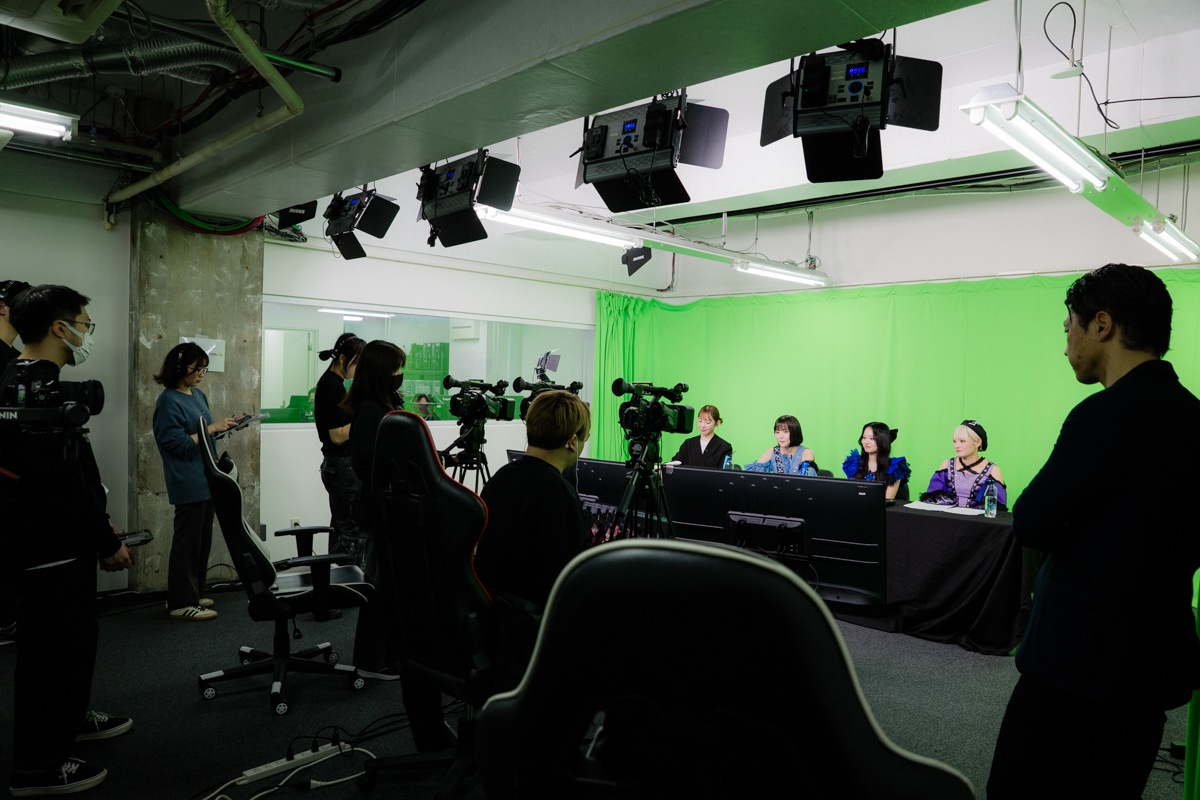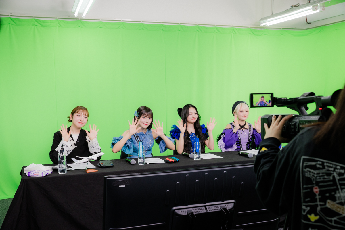 今回、その舞台裏に迫るべく、リアルサウンドが地上組の配信スタジオに潜入。本番前のリハーサルから密着することができた。地上組の福山梨乃、桐原美月、宮野静、進行を務めたKAWAII LAB.総合プロデューサーの木村ミサは、リラックスした表情で現場入りし、オープニング映像が流れた瞬間に「すごい!」と声を上げる。まだテスト段階にもかかわらず、リアルタイムで会話が成立していることに、メンバー自身がいちばん驚いている様子で、早くもその興奮が伝わってきた。