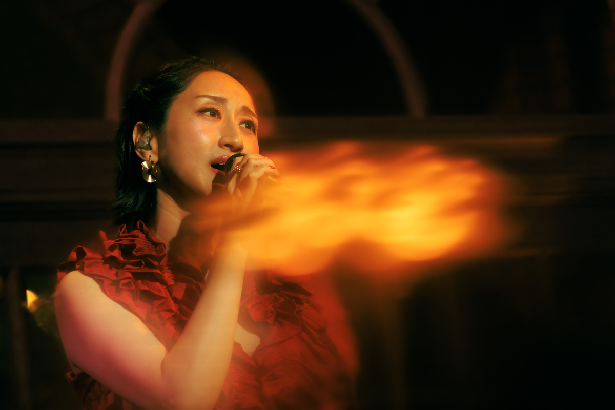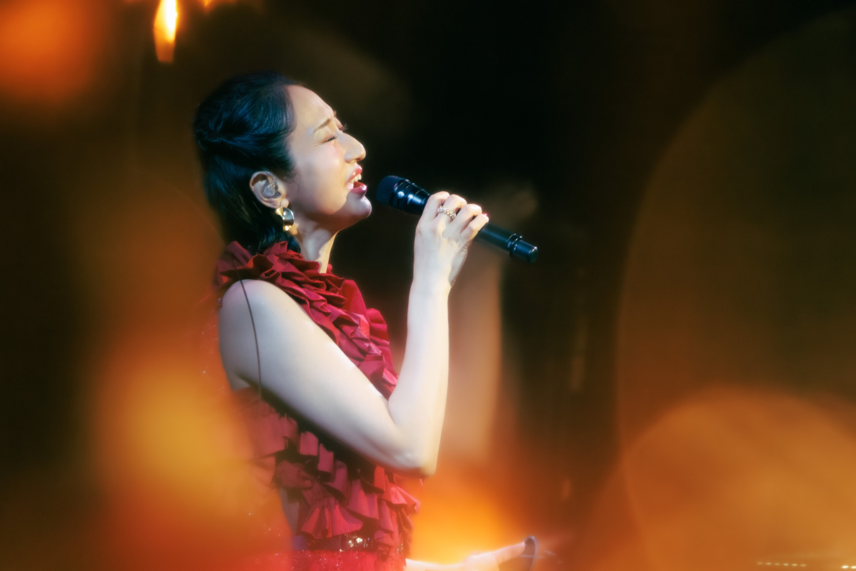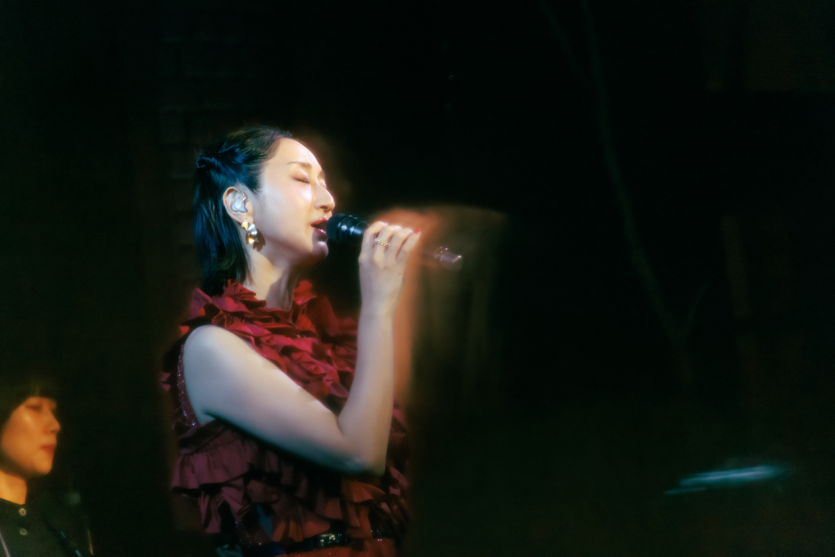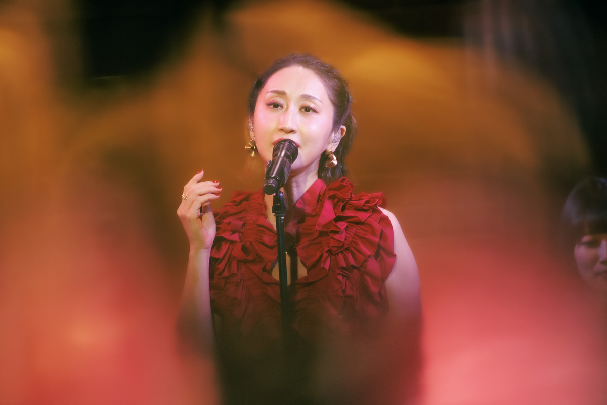 「次の曲はこのアルバムの中でもポイントになるような、スパイスになるような楽曲です」と始まったのは、1995年リリースの桂銀淑「べサメ・ムーチョ」。ステージが赤い照明に包まれると、空気は一変。情熱的な楽曲に観客たちも体を揺らしながら楽しんでいた。「『すずめの涙』とすごく迷ったんですけど、スパイシーにしたいなと思って」と同曲の選曲理由を語って、次の曲へ。1975年リリースの都はるみ「北の宿から」だ。Ms.OOJAの包容力のある落ち着いた歌声によって、原曲とは別の物語が見えてくるかのようであった。
