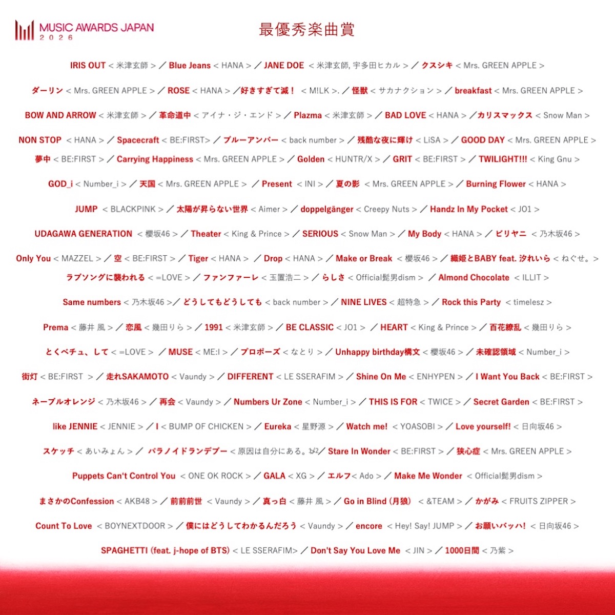 授賞式で表彰する全78部門にエントリーされた作品は約2,000作品・アーティスト。最優秀楽曲賞に米津玄師「IRIS OUT」やM!LK「好きすぎて滅!」、Mrs. GREEN APPLE「ダーリン」、サカナクション「怪獣」など100曲、最優秀アーティスト賞にMrs. GREEN APPLE、米津玄師、HANA、back numberら100アーティスト、最優秀ニュー・アーティスト賞にHANA、STARGLOW、僕が見たかった青空、BILLY BOOら50アーティスト、最優秀アルバム賞に『THE BEST 2020 - 2025』(Snow Man)、『prema』(藤井 風)、『No.Ⅱ』(Number_i)、『HAPPY BURSTDAY』(SEVENTEEN)など100作品がエントリー。そのほか、Best Global Hit from Japanに米津玄師「IRIS OUT」、アイナ・ジ・エンド「革命道中」、Creepy Nuts「オトノケ」など100曲、最優秀アジア楽曲賞にPLAVE「Dash」、Silet Open Up「Tabola Bale」など21曲がエントリーされている。
