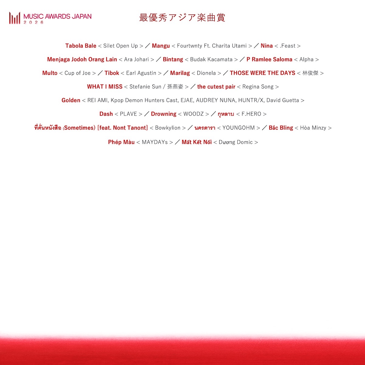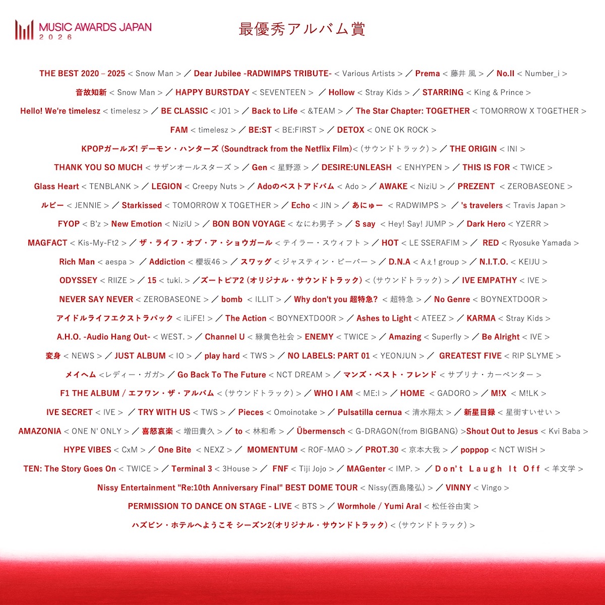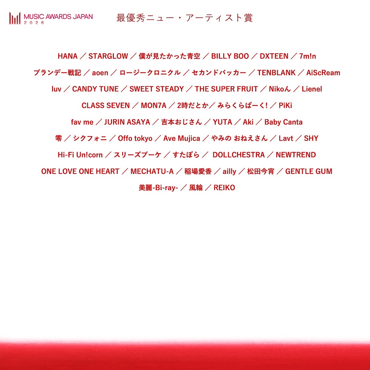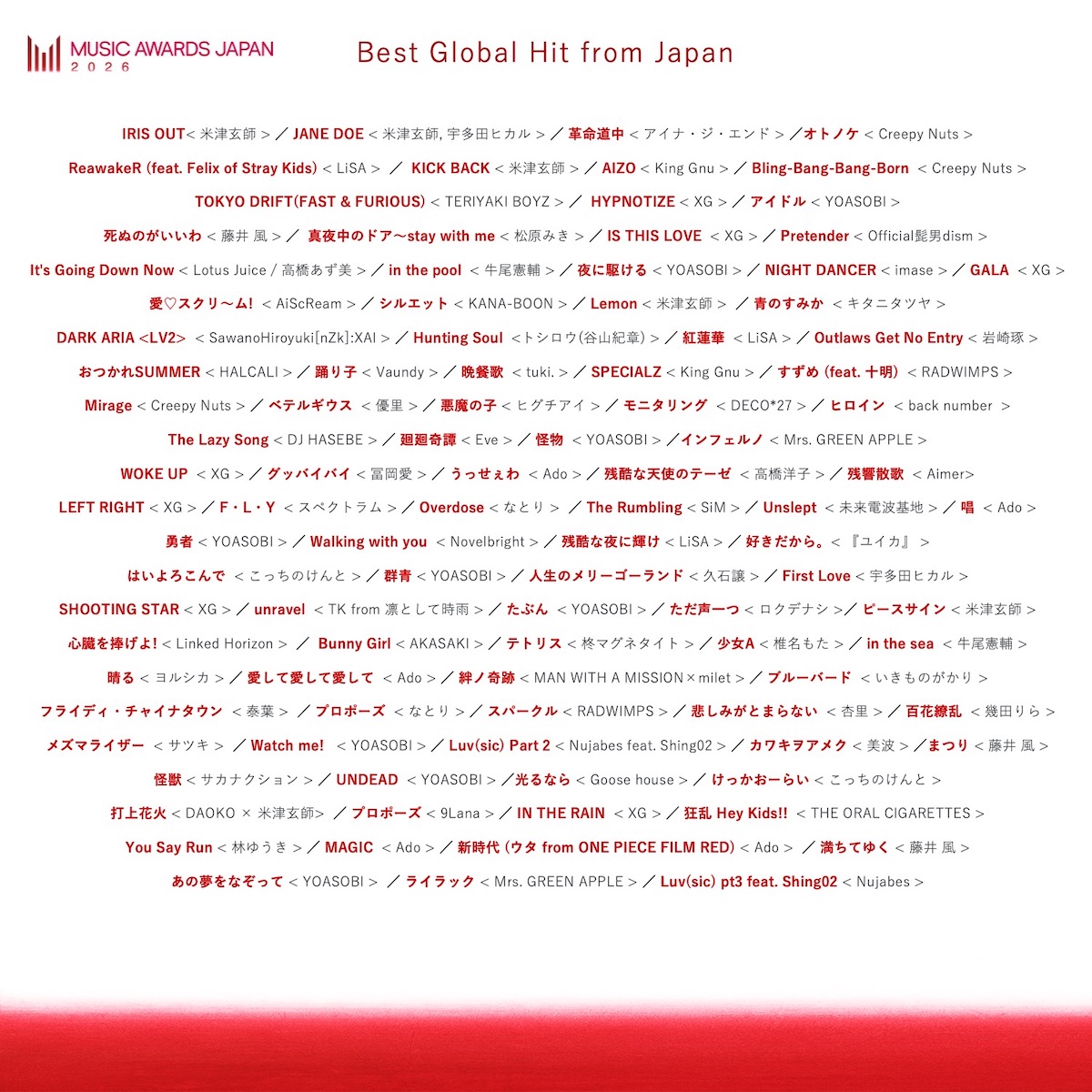 全エントリー作品は『MUSIC AWARDS JAPAN 2026』公式サイトで確認できる。