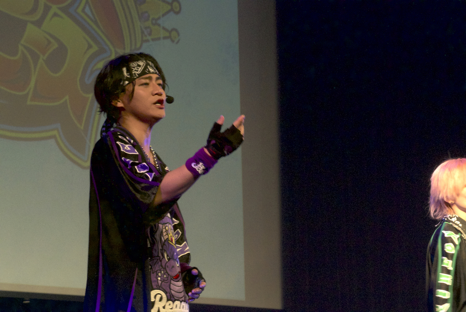 ボリュームたっぷりのOP映像が終わり、暗転が解けた瞬間、キャノン砲の轟音とともに「モンブランヘッド」のイントロがスタート。紙テープが空中に舞い、1曲目からいきなりメンバーはフロアへと降り立った。こーたとこぺは2階席へ駆け上がり、ステージが分断される演出でフロアを一気に掌握した。息つく間もなく、次は「プリティーボーイ」。こーたとこぺがイントロでハケたかと思えば、〈俺を見ろ〉のフレーズで再登場するという演出だ。リアルピースの息の合ったフォーメーションでライブは立体的に展開されていく。