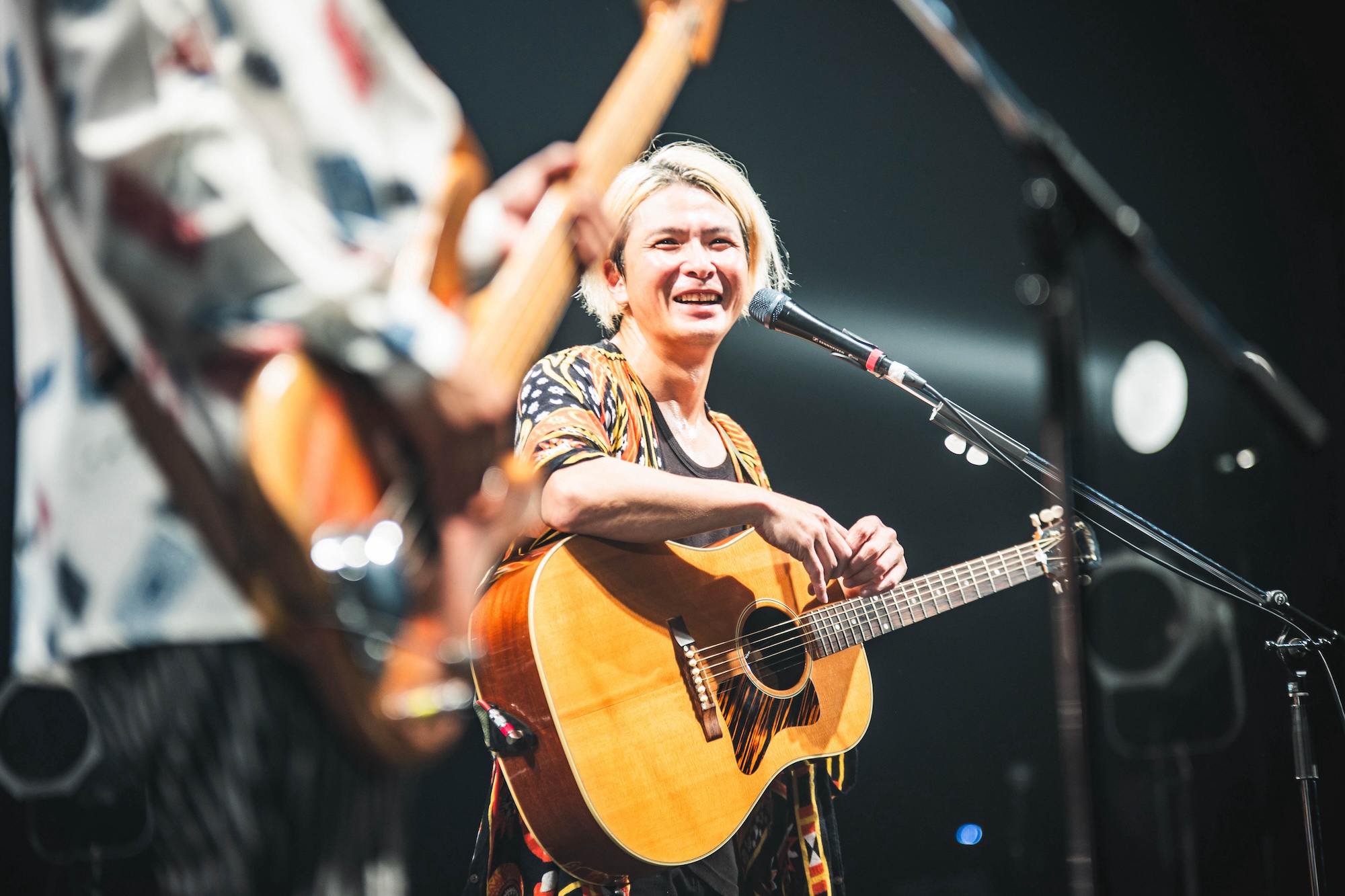以降「南に舵を取れ」「青春よ聴こえてるか」「愛を編む」「流星」を聴かせ、前川は「今日はうちの息子と奥さんも来ているんです。沖縄の海で、うちの息子に人生で最初に魚を釣らせてくれたのがORANGE RANGEのNAOTOなんです。そんなのもあるからかな、ここにいるみなさん全員が、僕にはおっきな家族に見えてます。お陰様で宝物に囲まれてます」と頭を下げた。そして「家族歌をやります、『アンマー』という曲です」と、バンドにとって初のシングル曲で日本有線大賞新人賞を受賞した代表曲「アンマー」を奏でる。20年前のリリース曲だが、きわめて新鮮な印象を受けるのは、バンドのルーツにして現在もなお彼らが沖縄音楽のメロディーを楽曲の根幹に置き鳴らし続けているからだろう。落ち着いたテンポの中に、ギュッと詰まった言葉。息継ぎが少ない前川の流れるような歌唱は、抑えきれない感謝の気持ちの表れにも感じられた。