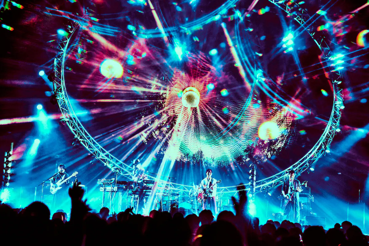 そんな絶好調のまま、ライブは後半に入っていく。手始めに『physical mind』のなかで異彩を放つ「NEVERMIND」。サイケでヘヴィなムードを生み出すパワフルなバンドサウンド、そしてステージから放たれるレーザー光線。まさに“フィジカル”な重量感で、先ほどのMCで少し弛緩した空気を一気にビシッと整えていく。ベースにギターにキーボードに歌、メンバーそれぞれの個性が際立つ「化け物」を経て「カーペット夜想曲」へ。ここまでどちらかといえば派手さを抑える方向だった照明や映像が一気にカラフルに弾けて、会場の空気がガラリと変わる。曲中でのコール&レスポンスもバッチリ決まり、そこから間髪入れず「ロング・グッドバイ」の田辺のギターが爽やかな風を連れてくると、ライブもいよいよ終盤である。