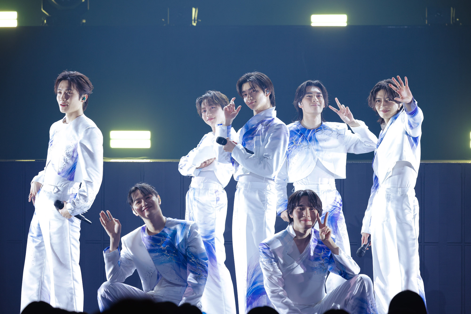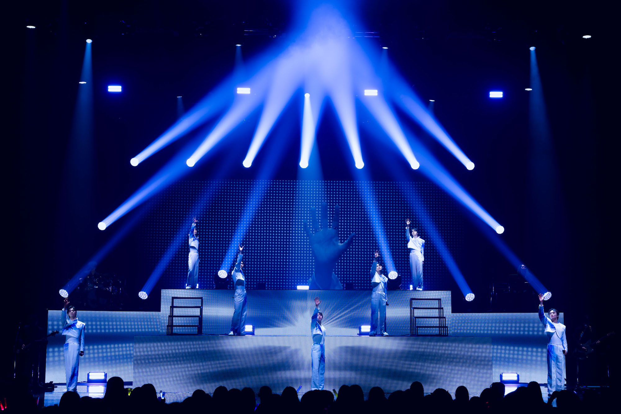 会場に響くのは、時計の針が刻まれていく音。やがてレーザーが一本の線を描き出すと、同時に心電図のような音が聞こえてくる。その線が箱型へと変化し、内部に浮かび上がる大倉空人、小泉光咲、桜木雅哉、長野凌大、武藤潤、杢代和人、吉澤要人のシルエット。ツアータイトルにある“箱庭”という世界観を想起させるオープニングだ。次の瞬間に幕が落ち、1曲目の「藍色閃光」へ。間奏ではメンバーが手を掲げる動きに呼応するようにライティング装置が下から上がっていき、まるで彼らが光を操っているかのような演出が美しかった。