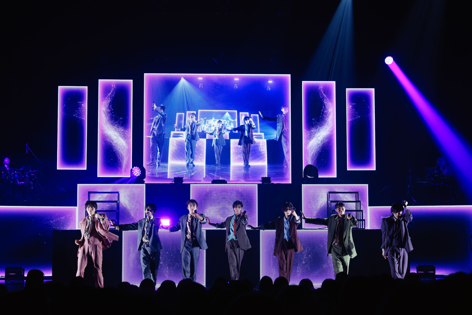 「パラノイドランデブー」「貴方に溺れて、僕は潤んで。」を経て、再びヴィヴァルディの「四季」より「冬」第1楽章がバンドによって奏でられる。スクリーンの映像にも、冬の雪景色が広がっていく。ステージに戻った7人は、怪しげな笑みを浮かべる。そのまま「Mania」で観測者たちを引き込むと、〈JUDGE〉の掛け声も響いた「因果応報アンチノミー」では、杢代が「大宮、まだまだいけるだろ?」と煽って会場のボルテージを引き上げていく。遠藤周作の『沈黙』を題材にした、EPでは“冬”にあたる「Silence」を届け、続く「スノウダンス」はテクノハウスのアレンジが施されていた。〈季節は廻る何度でも〉と歌われるこの曲は、なんて今回のライブに相応しいのだろうか。そんなセットリストの妙も感じさせながら、7人は曲の終盤で華麗に舞い踊り、ステージを去っていった。