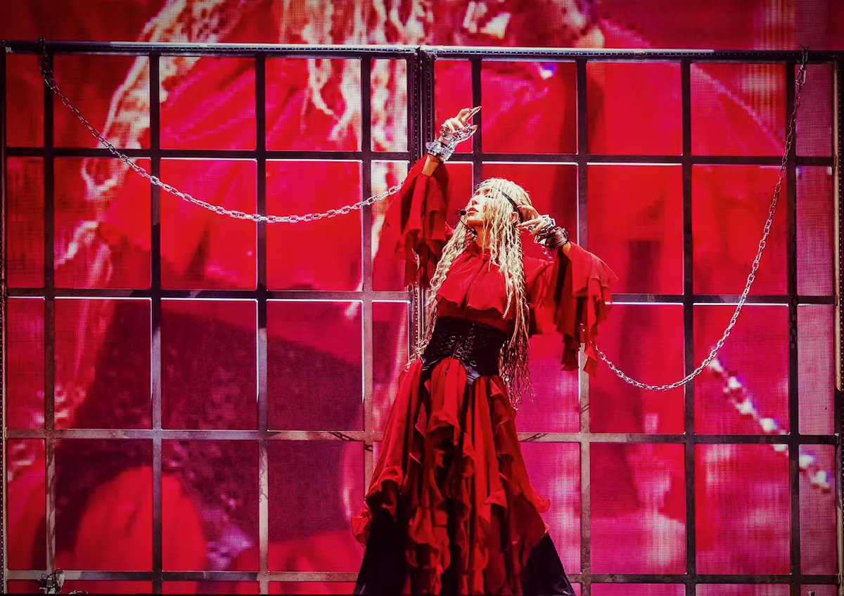生成AIを駆使して創り出された細密な映像が映し出され、会場はまるで中世ヨーロッパのような世界観に包まれた空間へと変貌する。彼女を閉じ込める檻を巧みに使った演出では、ドローンカメラに向かって手を伸ばしながら歌う様子がビジョンに映し出され、非常に立体的で見応えがあるものだった。かと思えば、パフォーマーとの息の合ったダンスパフォーマンスでも魅せる。世界観が統一された衣装は、パフォーマーもステージの一部といった印象。ステージからセンターステージへと延びる花道を、浜崎を中心としたその一団が練り歩く様子も実にかっこよく、クイーンの名にふさわしい華やかさだ。