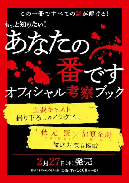 最高視聴率19.4%、ブームを巻き起こした大ヒットドラマ『あなたの番です』の、オフィシャル考察ブックが、2月27日に発売されることが決定された。2019年の「新語・流行語大賞」にもノミネートされた『あな番』を徹底解剖。