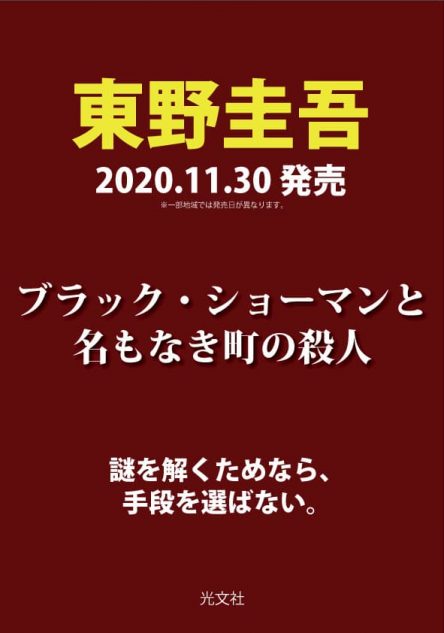 東野圭吾の最新刊『ブラック・ショーマンと名もなき町の殺人』が、11月30日に光文社より発売される。予約受付が開始された。