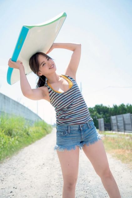 26歳なのに周りのスタッフさんから「笑うと5歳くらいの子みたい」と言われるほど、純粋に楽しんでいたみたいです(笑)。ハウススタジオでは逆に、黒の水着を着た大人っぽいカットが多いので、海でのはしゃぎっぷりとギャップを感じて頂けると嬉しいです!