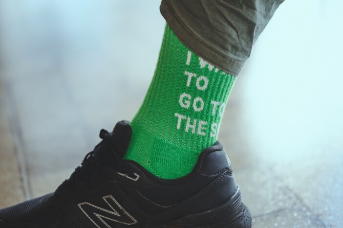 あと、ファミマの靴下をいつも買いますね。今日は緑なんですけど、カラフルな色が揃ってるんですよ。これはほどよく自分をださくできるじゃないですか。忙しくて家に帰れずにお風呂に入れないような時に、靴下だけでもコンビニで買いたくなる。