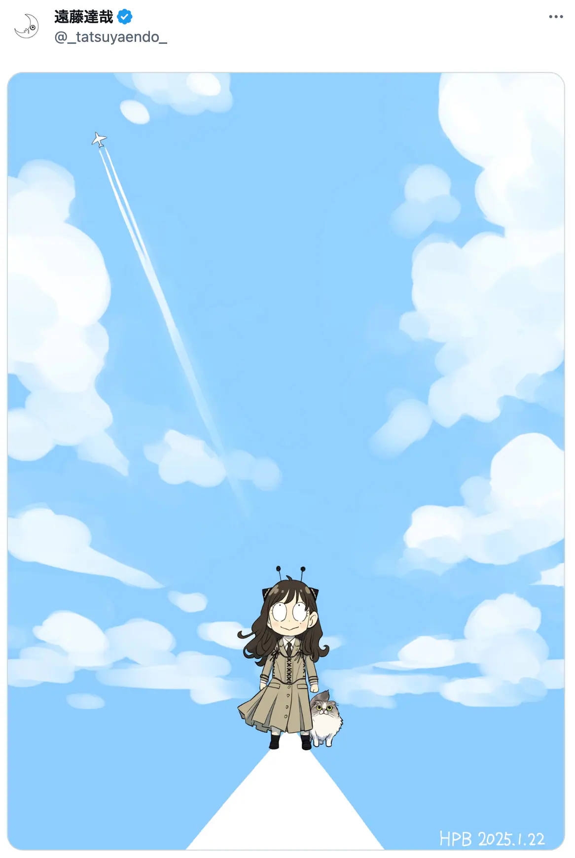 このたび投稿されたのは『SPY×FAMILY』の登場キャラクター・アーニャ(と思しき人物)が、水色の鮮やかな世界の中央に立つイラスト。“キャンバスに指で描くような白い飛行機雲”が浮かぶ空の下で、アーニャの前に伸びるのは終わりの見えない白線ーー。