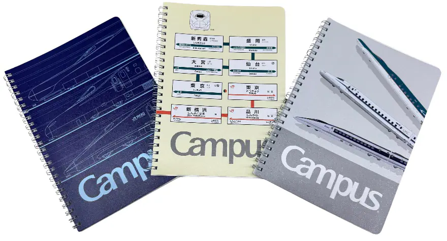 本商品は、コクヨのキャンパスリングノートに、各社の人気列車であるはやぶさ(JR東日本)、N700S(JR東海)、500系(JR西日本)をあしらったコラボデザイン。表紙は、駅名標・おもちゃの新幹線・線画新幹線の3デザイン。中面の罫線最下部には、線路のイラストをあしらっている。3冊セットで1,782円(税込)。