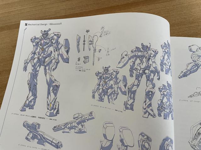 現在、映画館では通常盤と豪華版の2冊が販売されている『GQuuuuuuuX』のパンフレット。通常盤が1200円、豪華版は2冊セットで3000円という価格設定であり、一見すると「豪華版、高いな……?」という印象もあるが、本編の内容が気に入ったのなら豪華版の購入をおすすめしたい。本作のパンフレットは設定資料集的な趣もある内容だが、通常盤と豪華版の二冊を並べて読むことで情報量がグッと増えるのだ。